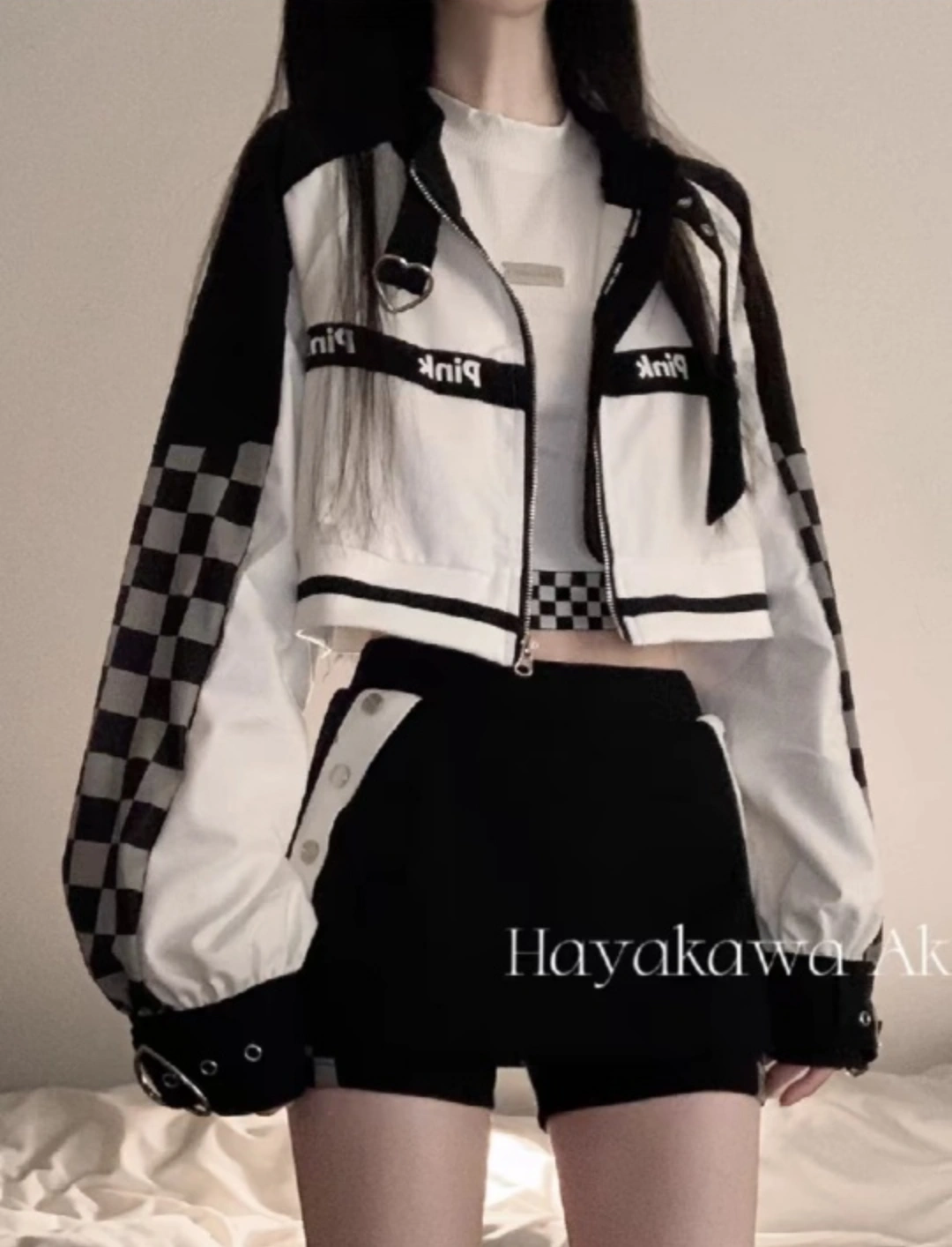 Black and white checkered cropped jacket with zipper closure and long sleeves. Chinese Brand. Worn 4 times.
