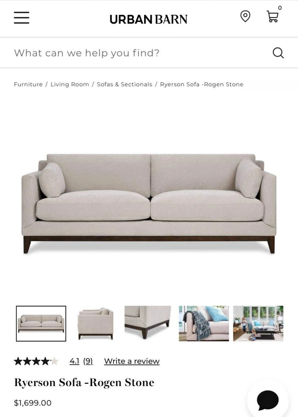 URBAN BARN RYERSON COUCH (2 available) Excellent condition(no rips or stains) .Cushions are nice and firm .Deep seating ,comfortable and cozy . The couch is freshly steamed clean and ready for your family to enjoy Measurements are: 87"L × 39"W × 32 " H Comfortable, durable, beautiful piece Retails for $1699 + tax each Pick up in Whitby