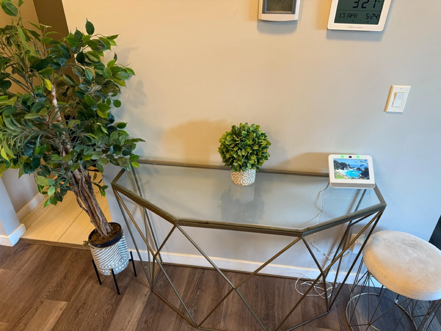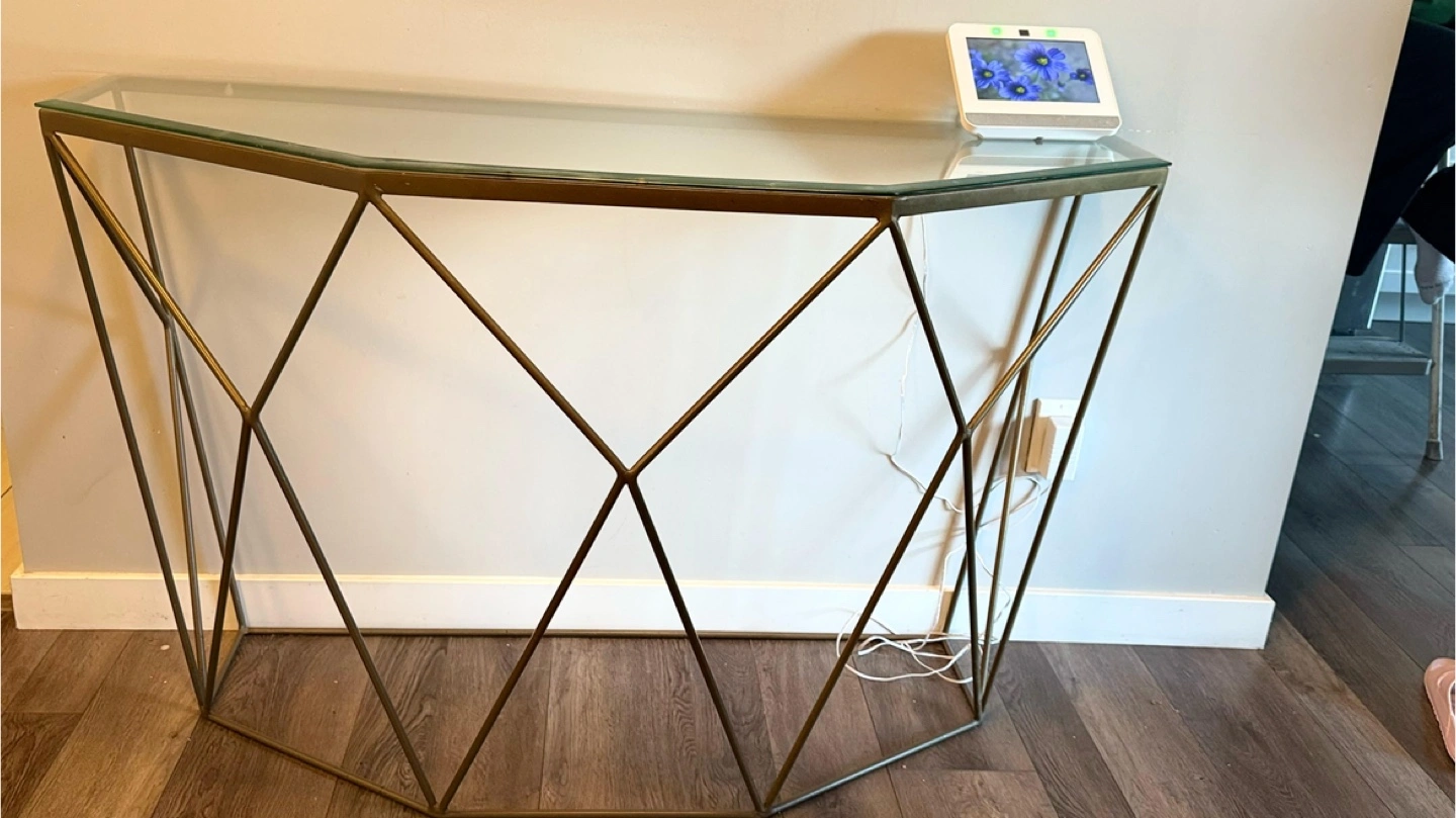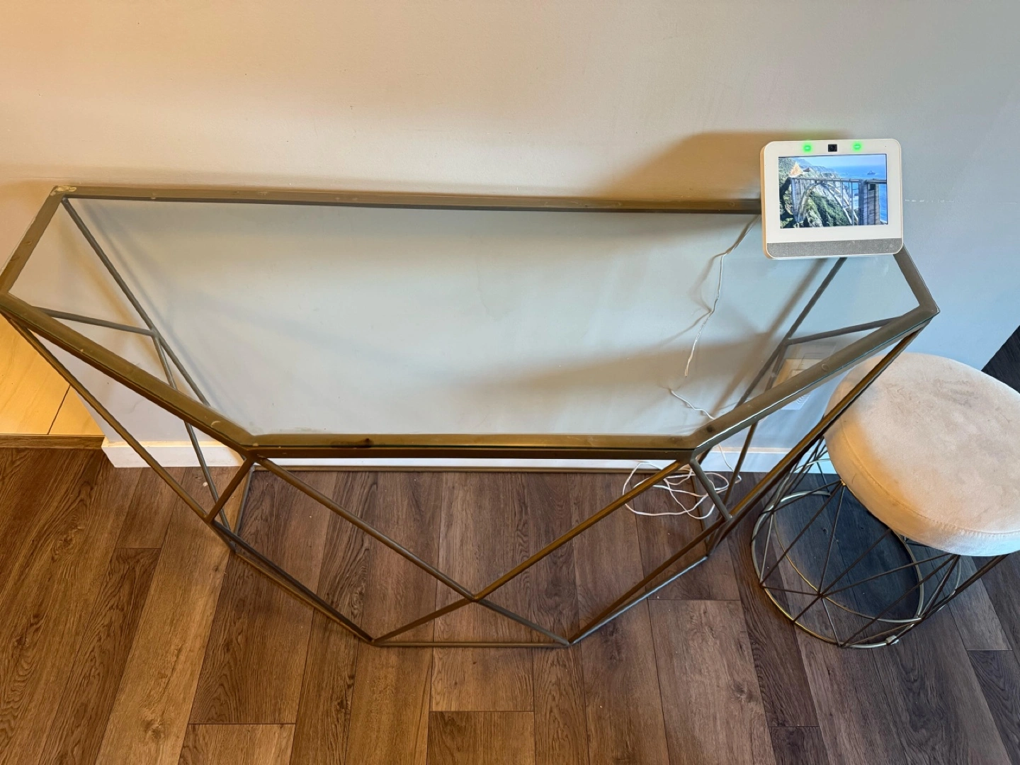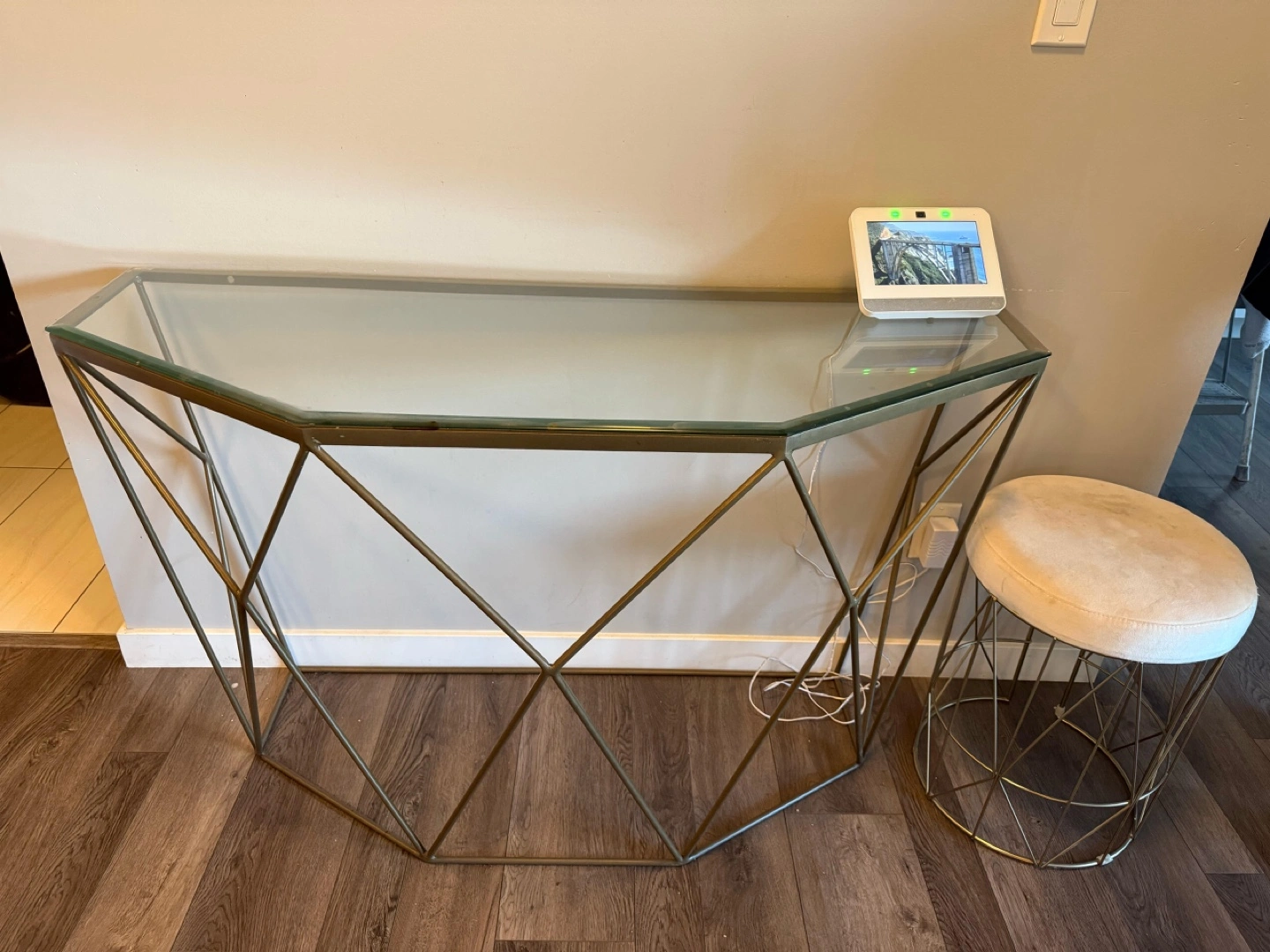 Urban barn Console table with a geometric metal frame. The table features a glass top. The metal frame has a dark gold finish. This table could easily serve as a stylish addition to your home. Bought it for 450$ asking 175$ Height 78cm Length 122.5cm Depth 45cm Pet free smoke free home Pick up Cranston SE