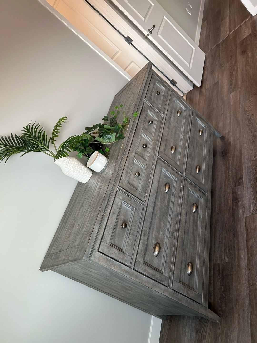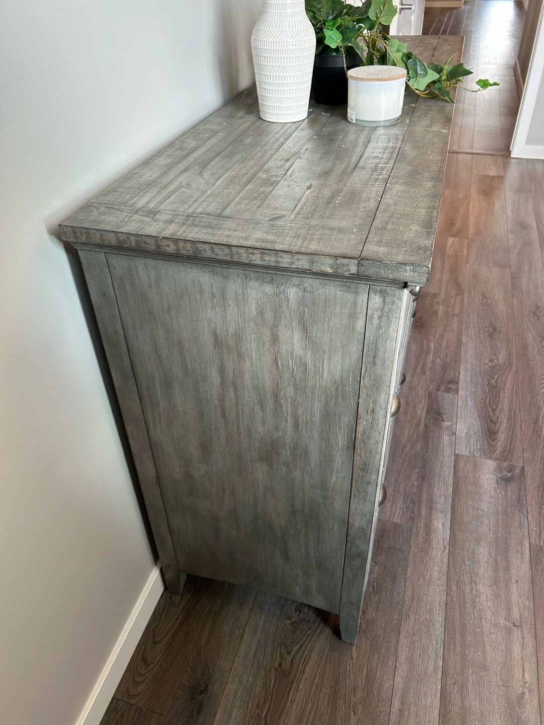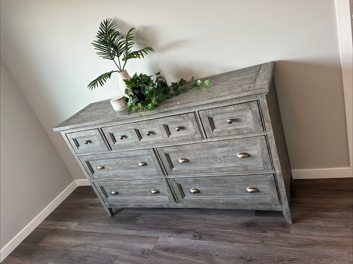 A grey dresser with several drawers. It has a light, distressed finish. The metal handles have an antique brass look. You could use this dresser to neatly store clothes and other items in your bedroom, creating a serene space. Pet free smoke free home Pick up Cranston SE