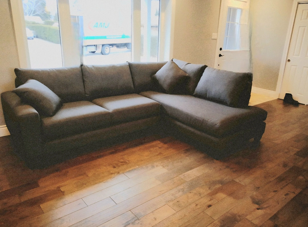 Here's a comfortable sectional sofa for sale. In a deep, neutral tone. Perfect for curling up with a good book. The cushions look cozy. Provides lots of seating space.