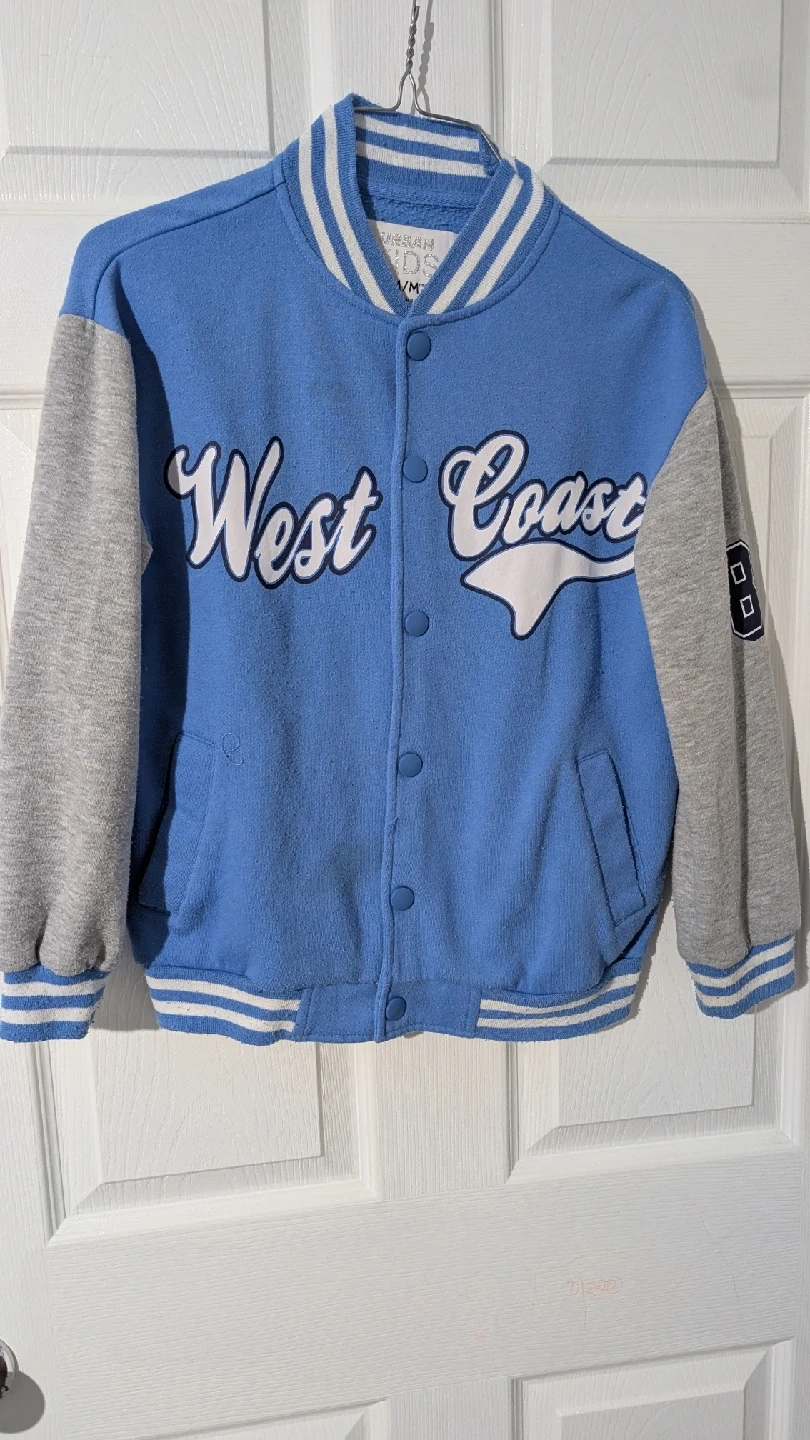 18Here's a cute Urban Kids varsity jacket! It's a size M and features a light blue body with grey sleeves. The words 'West Coast' are stitched in white across the front, adding a fun touch to this classic style small stain