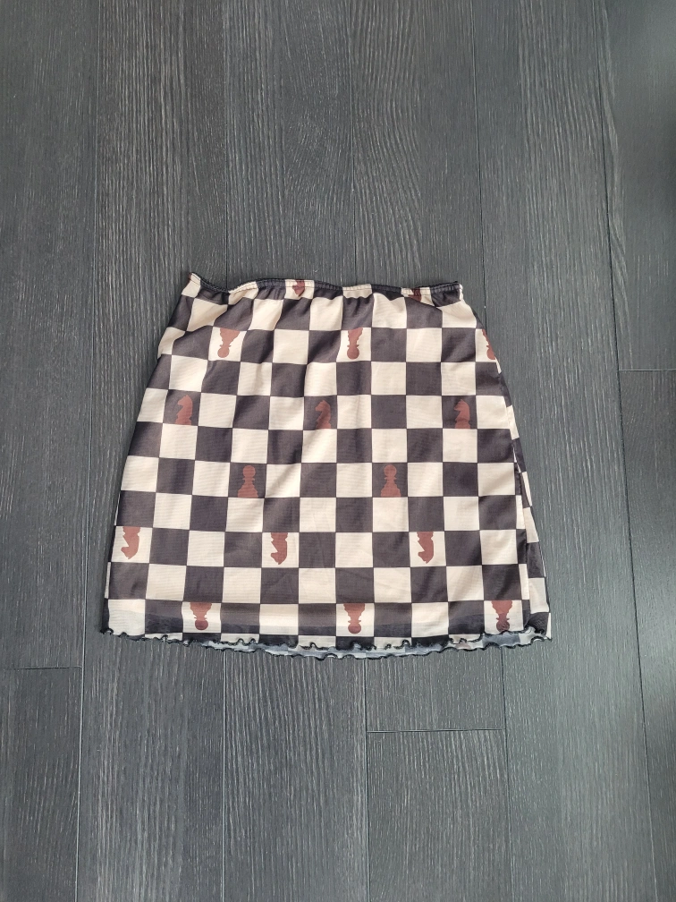 106Mini skirt, black and beige checkered pattern. Features brown chess piece silhouettes. Elastic waistband. Mesh-like material. Scalloped hem.