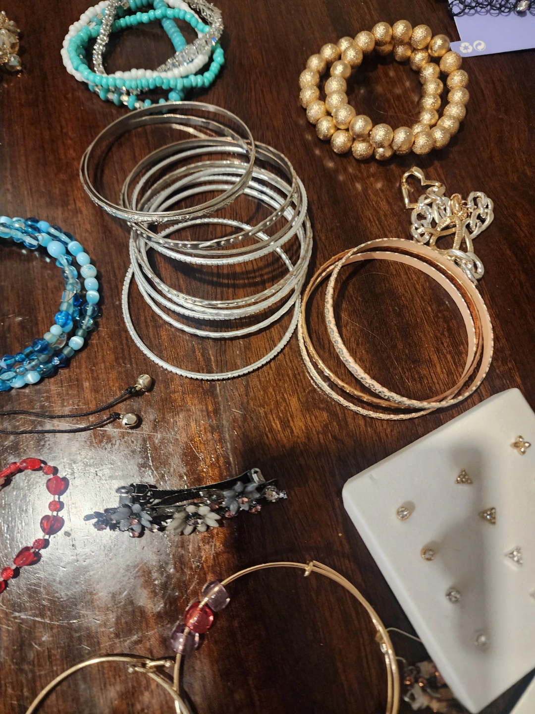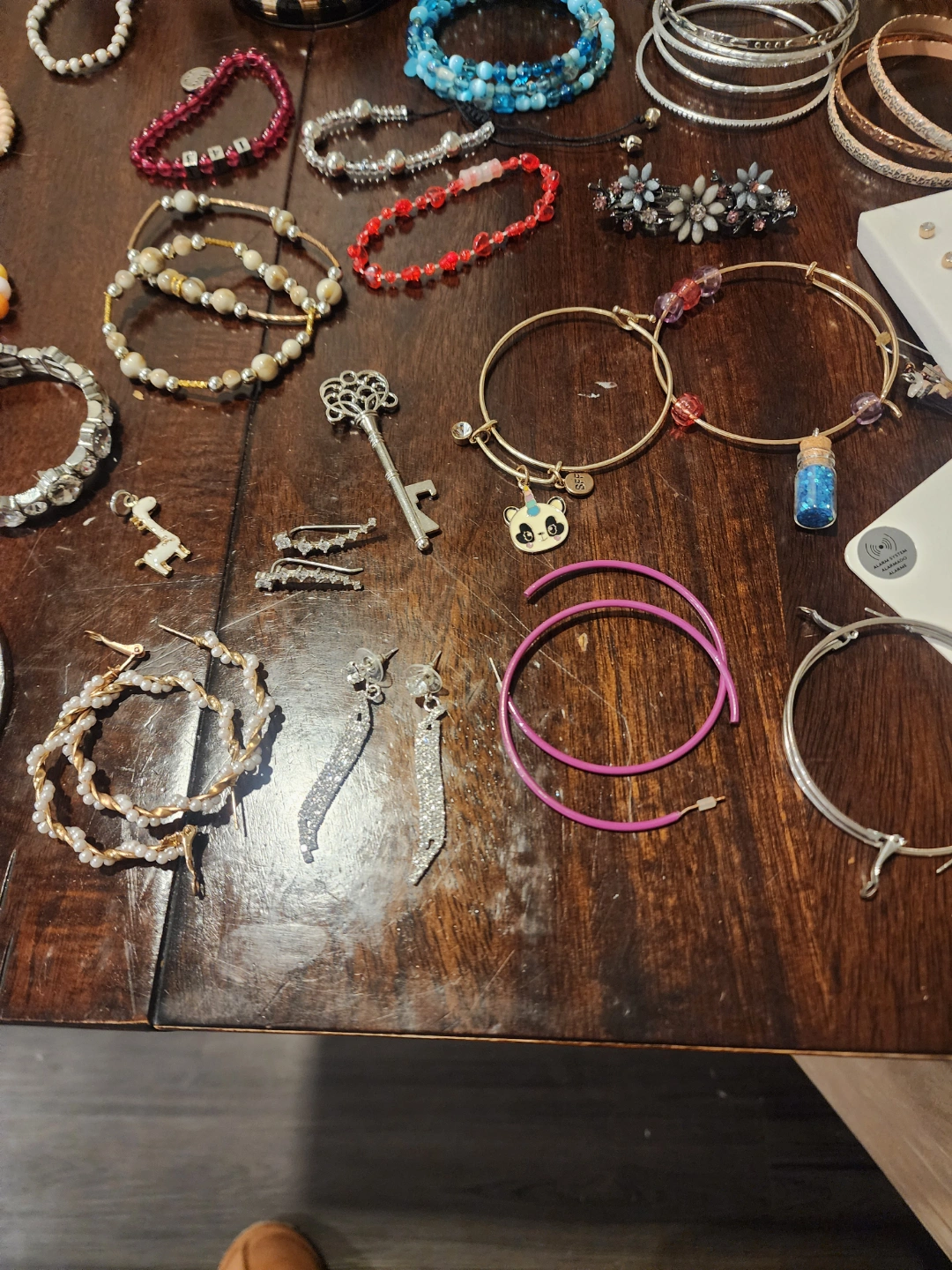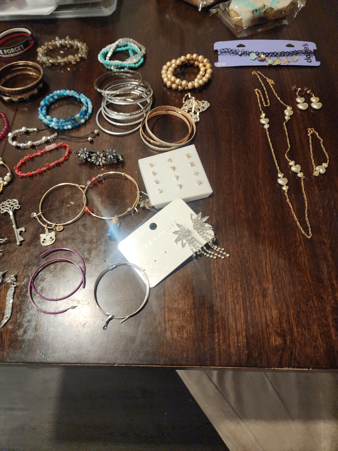 Various bracelets, earrings, charms, and necklaces. A great way to add some flair to your wardrobe and feel your best.