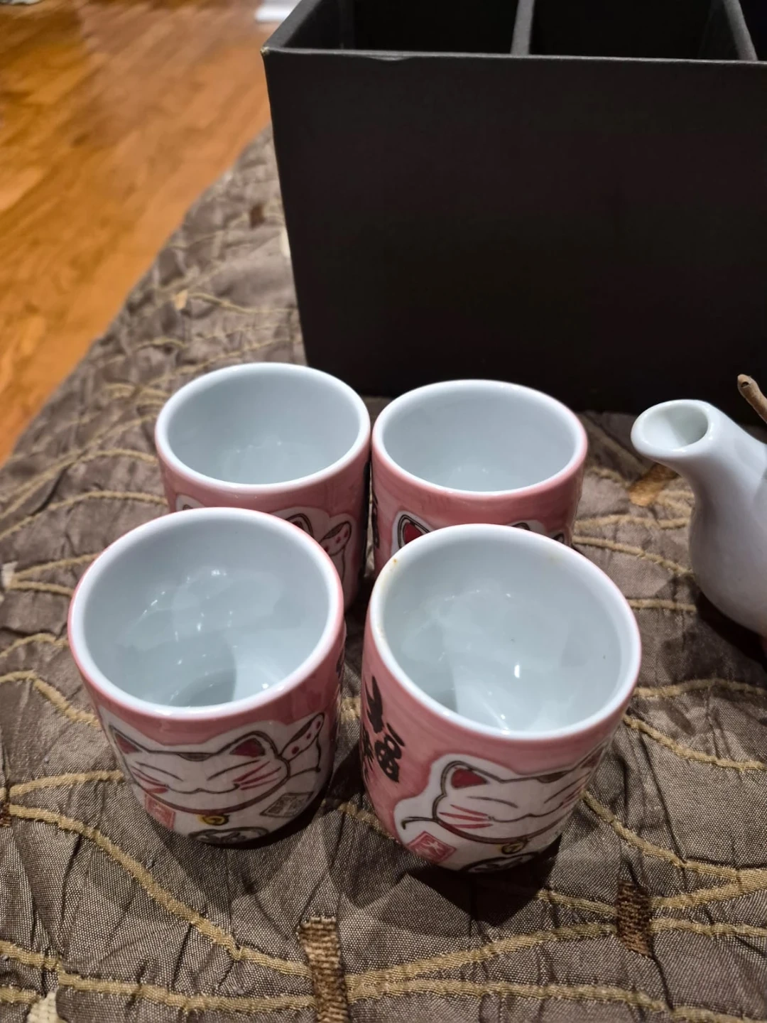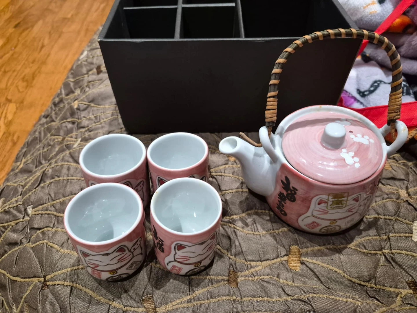 This set includes a teapot and four small cups, all decorated with the lucky Maneki Neko cat motif. The teapot has a charming woven handle, and the cups are a lovely shade of pink. It comes in a presentation box.