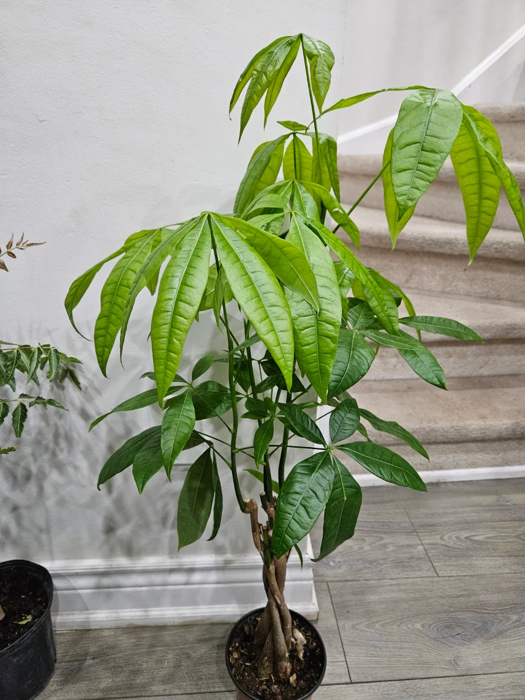 Healthy money tree plant, approximately 24 inches tall. Braided trunk with vibrant green leaves. Comes in a brown pot.