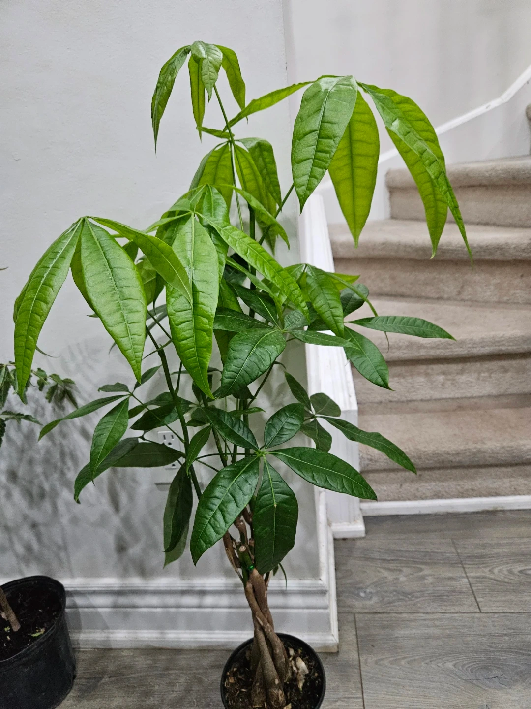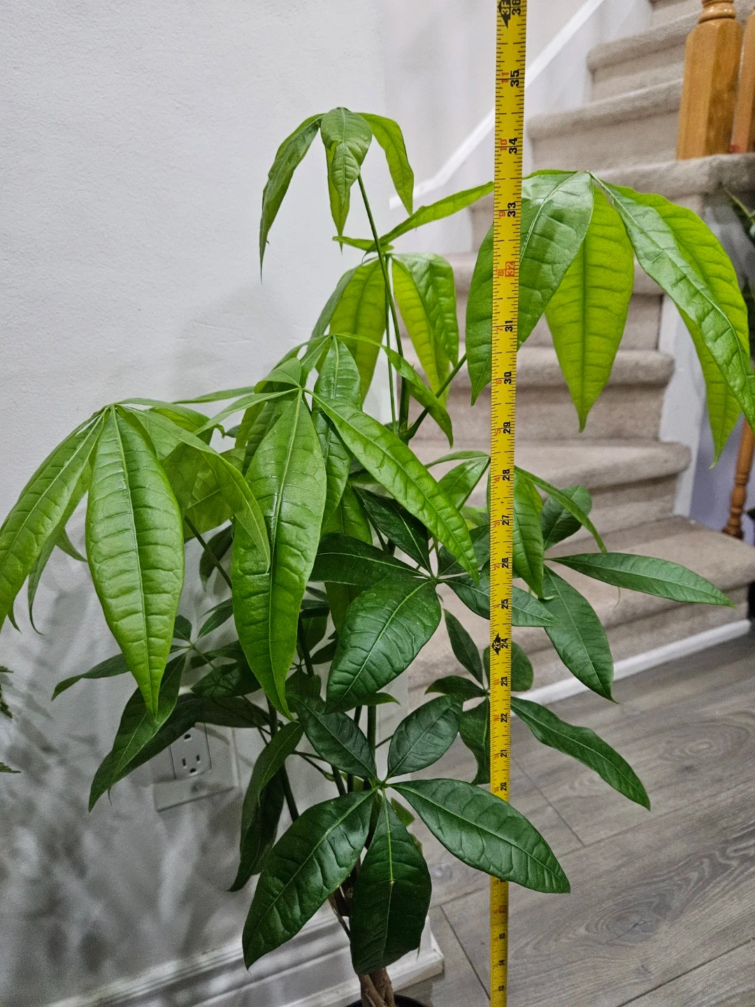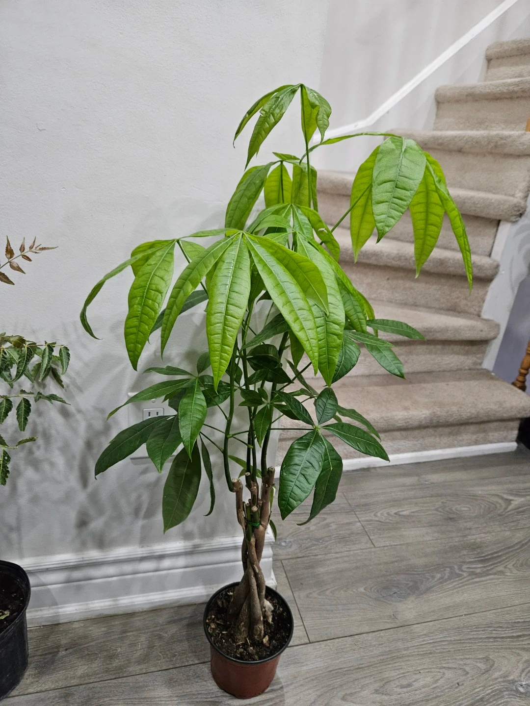Healthy money tree plant, approximately 24 inches tall. Braided trunk with vibrant green leaves. Comes in a brown pot.