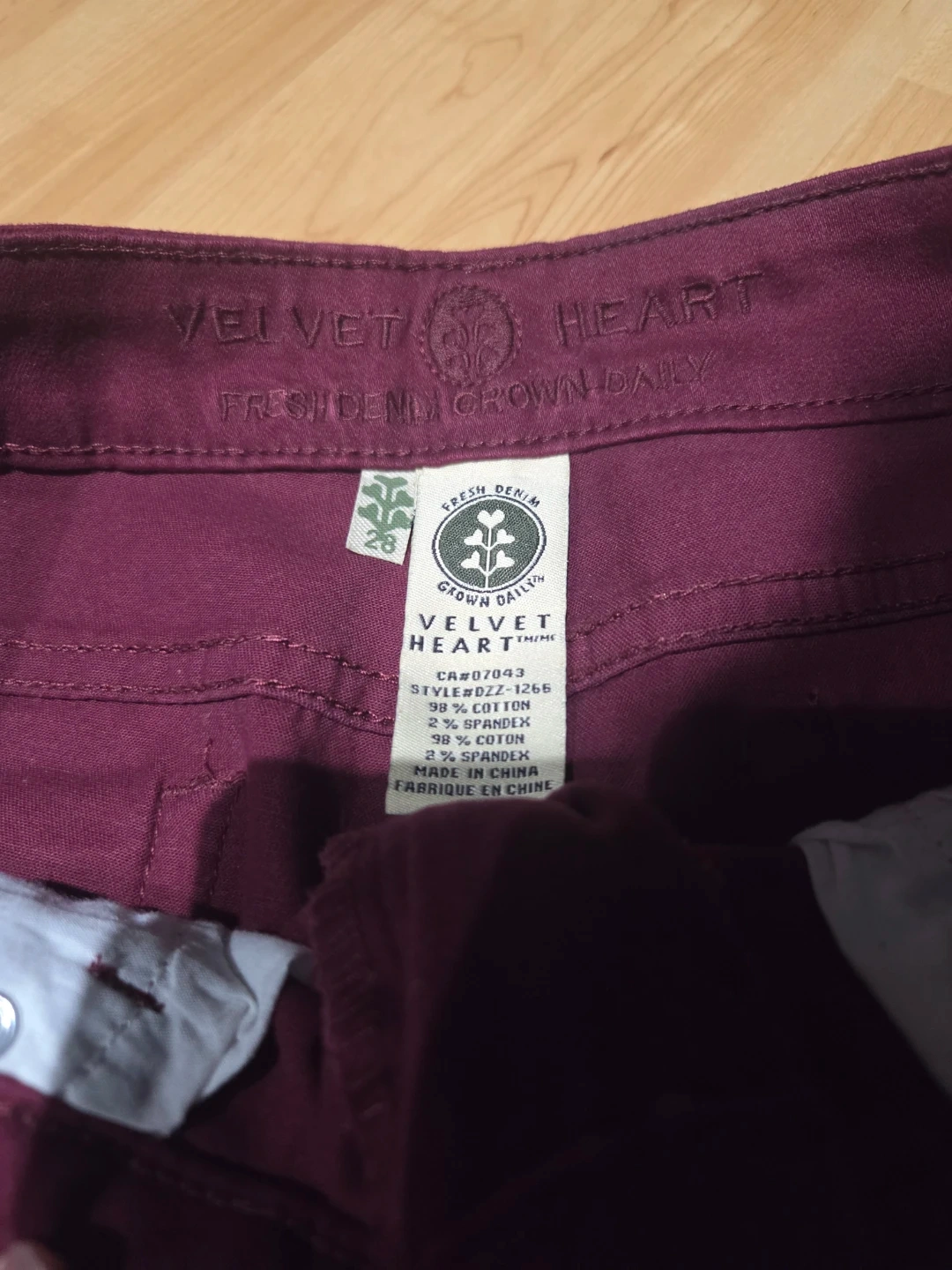 Velvet Heart jeans in a rich burgundy colour. These jeans are made with 98% cotton and 2% spandex for a comfortable stretch fit. They're a size 28.