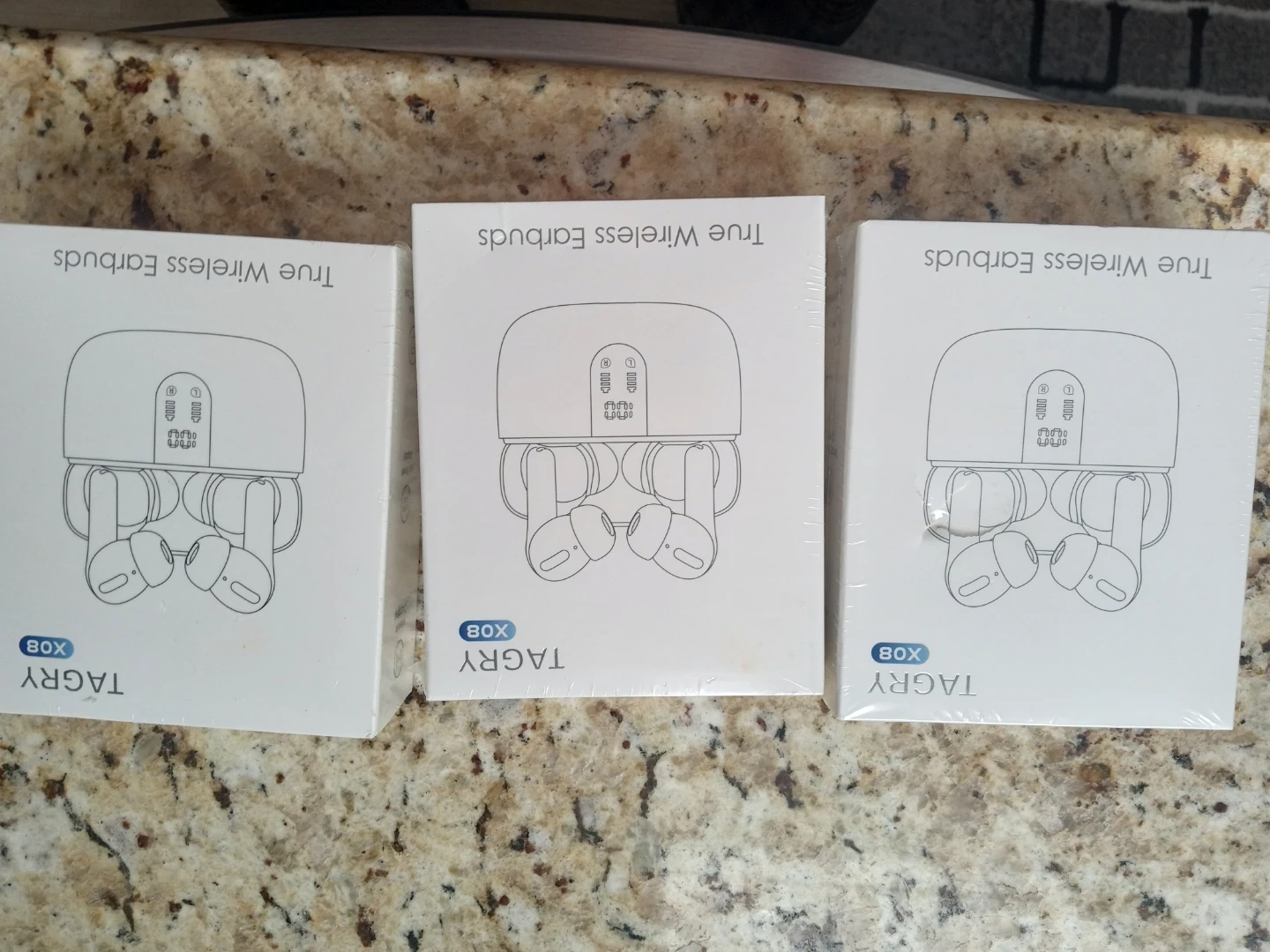 Brand new TAGRY X08 true wireless earbuds. Each box includes the earbuds and charging case. They offer up to 6 hours of music playtime and have an IPX5 water resistance rating. Supports iOS/Android/Windows devices. Standby time is 60 hours.