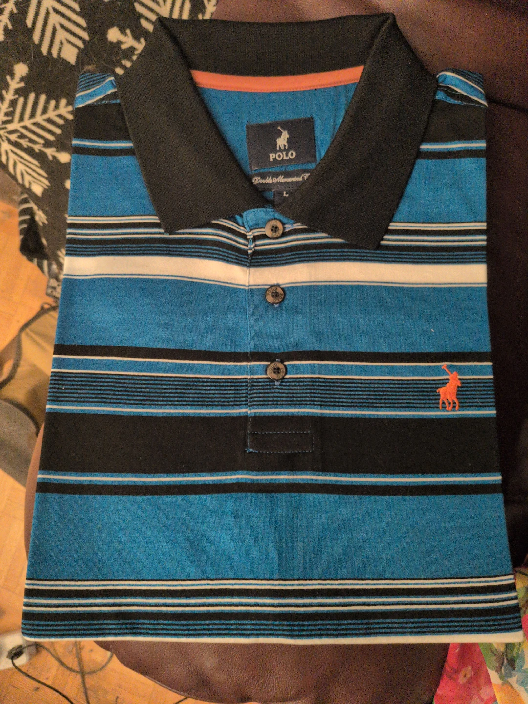 Looking to pass along this Polo Ralph Lauren polo shirt. It's a size large and features a cool striped pattern in shades of blue and black. The classic polo style makes it a versatile addition to any wardrobe!