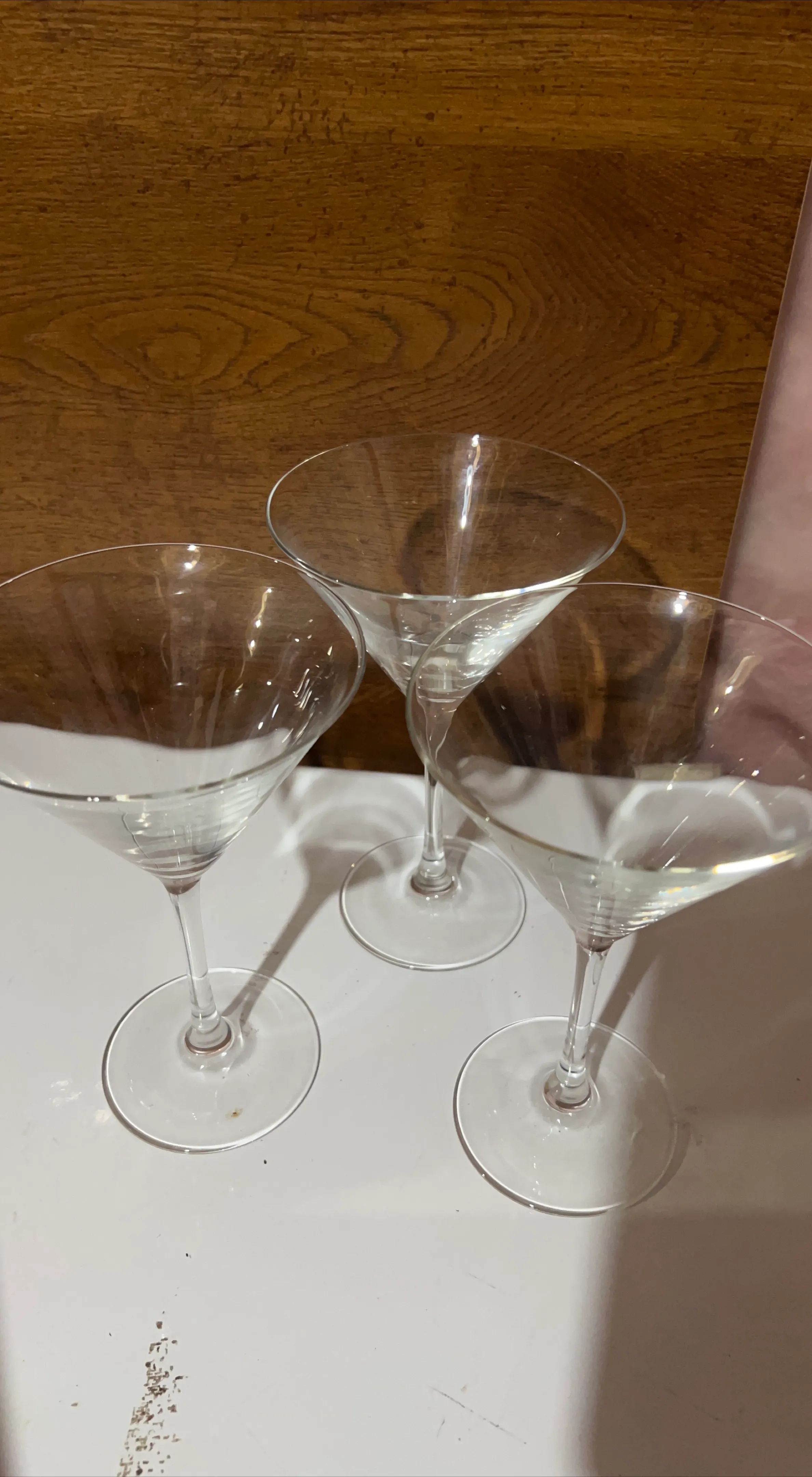 Selling a set of three martini glasses. They are in good condition and ready for your next cocktail party! Perfect for enjoying your favourite martini or other mixed drinks