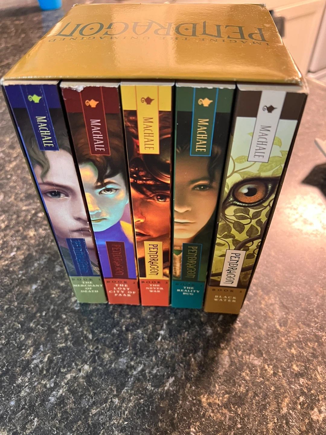This is the Pendragon series box set by D.J. MacHale. It includes the first five installments of the epic adventure series. The books are in a slipcase.