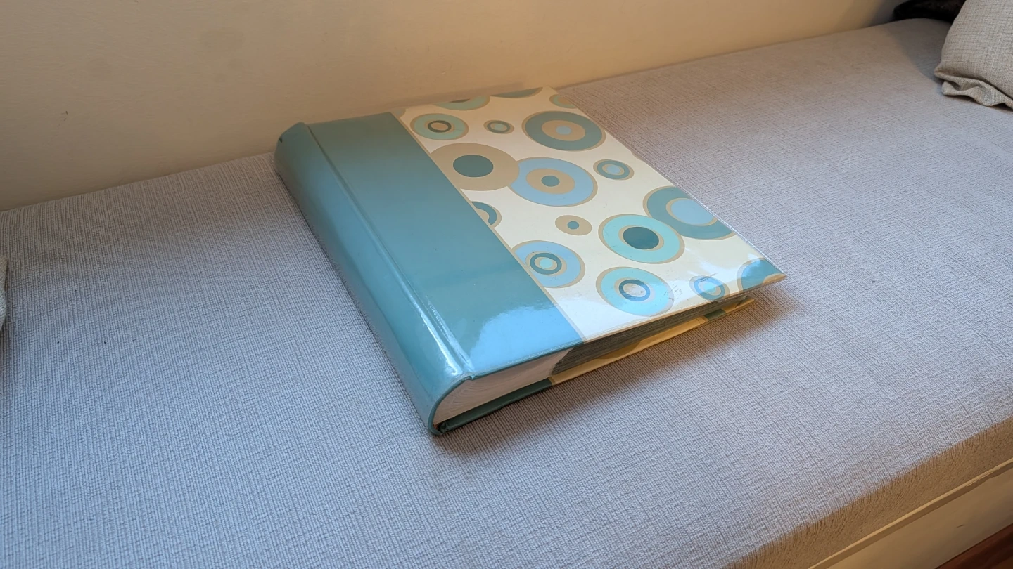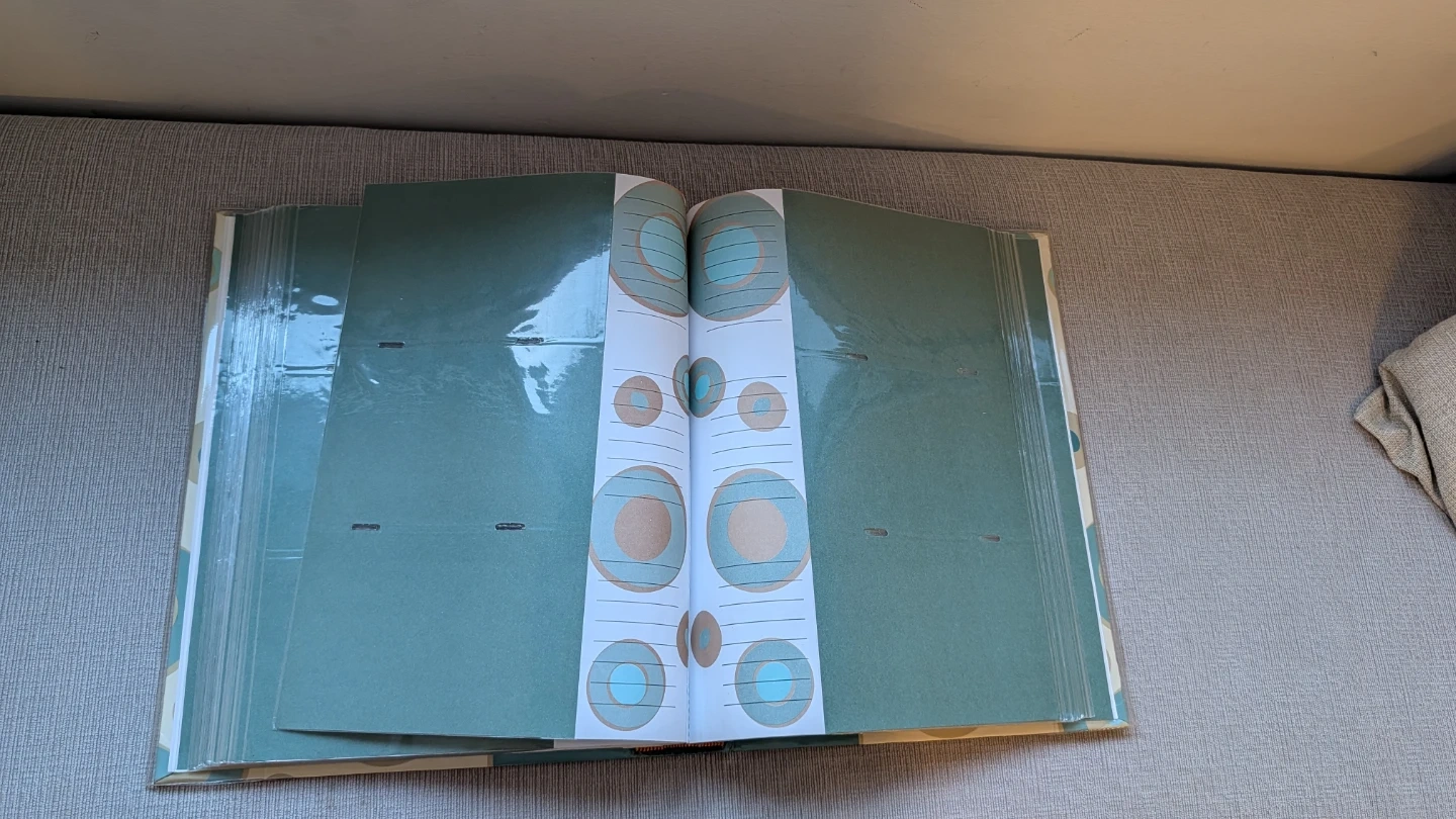 This photo album binder features a fun retro circle design in shades of blue and beige. It has clear protective pages for your photos. It's great for organizing your cherished memories!