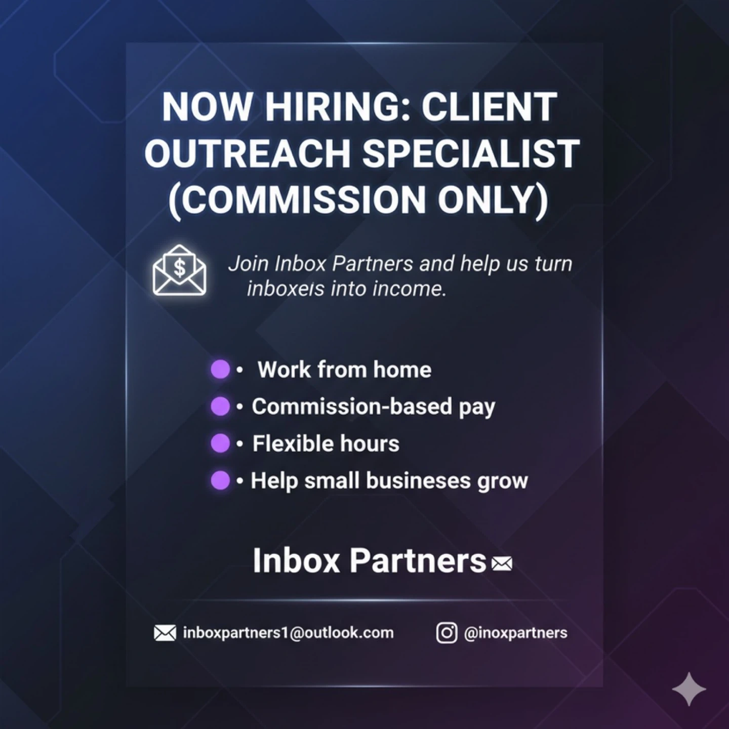 31• 100% remote work • Commission-based pay (no limits!) • Flexible schedule We’re looking for a motivated, talkative, and driven person who can reach out to small business owners and help them grow through email marketing. If you love sales, communication, and earning based on performance — this is for you. 💼 What You’ll Do: • Reach out to potential clients online or by phone • Explain our email marketing services • Close deals and earn commission for every sale 📧 Apply now: inboxpartners1@outlook.com 📱 Instagram: @inboxpartners