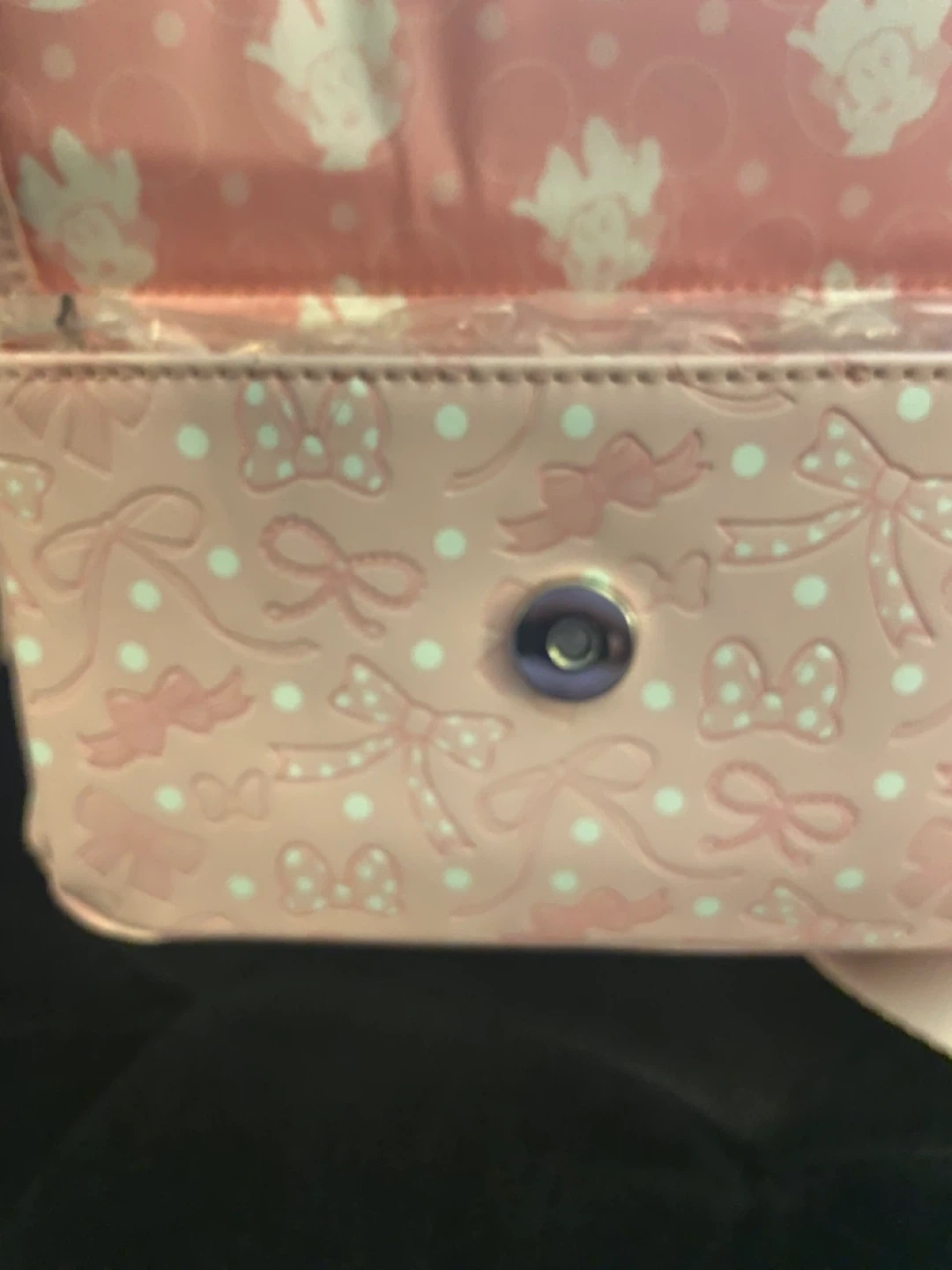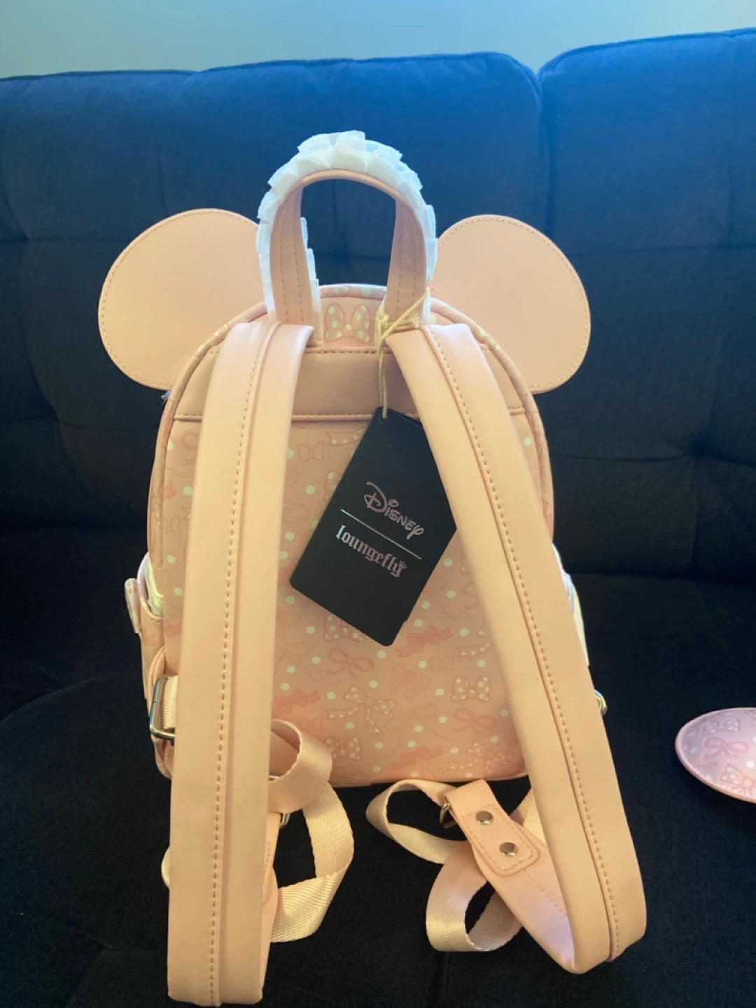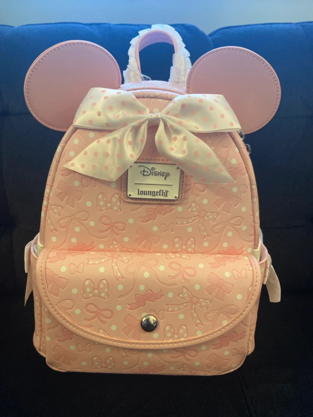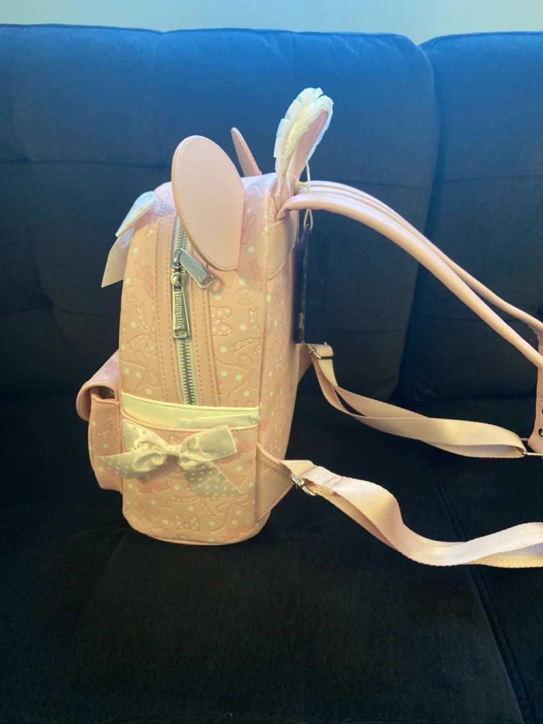 This is a Loungefly Disney Minnie Mouse backpack with matching ears in a lovely pink colour. It's adorned with a playful polka dot and bow pattern. Features adjustable shoulder straps for comfort. Never used. It is a bit too big for the intended user.