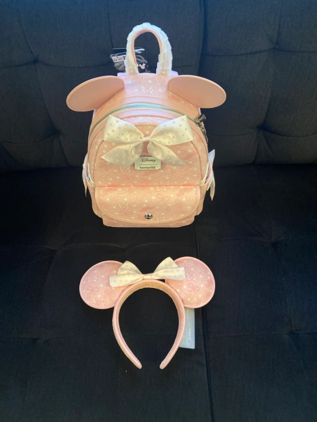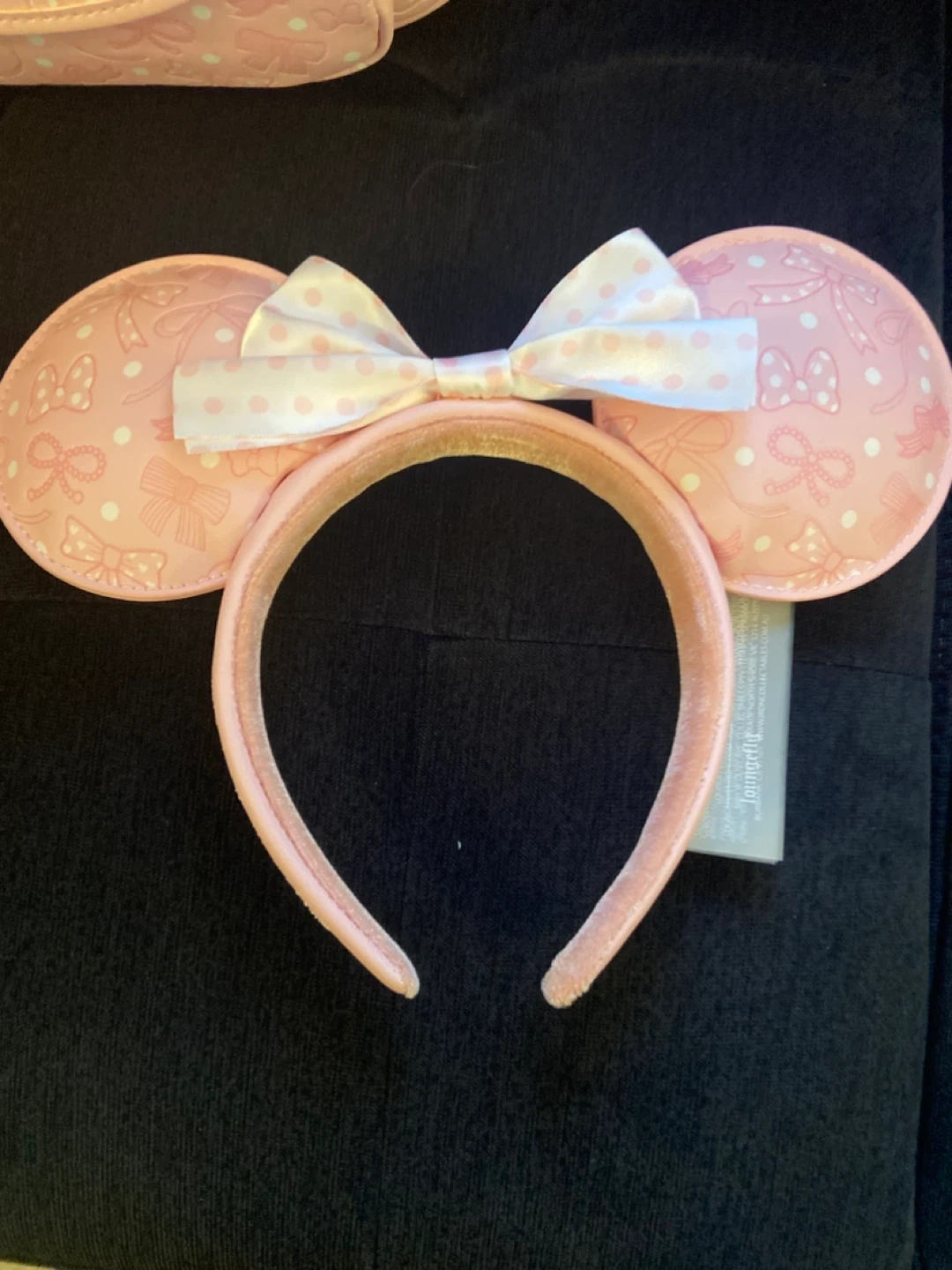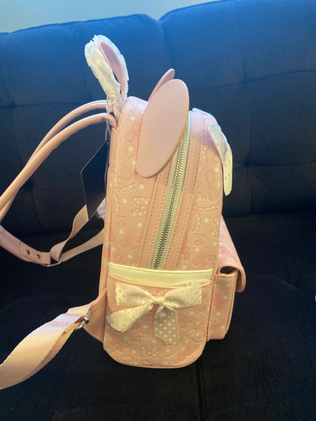 This is a Loungefly Disney Minnie Mouse backpack with matching ears in a lovely pink colour. It's adorned with a playful polka dot and bow pattern. Features adjustable shoulder straps for comfort. Never used. It is a bit too big for the intended user.