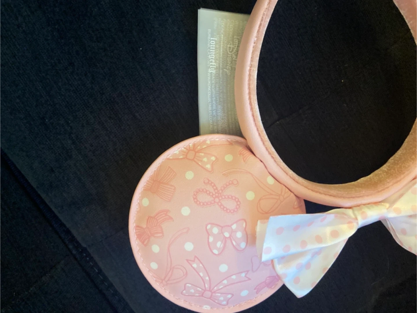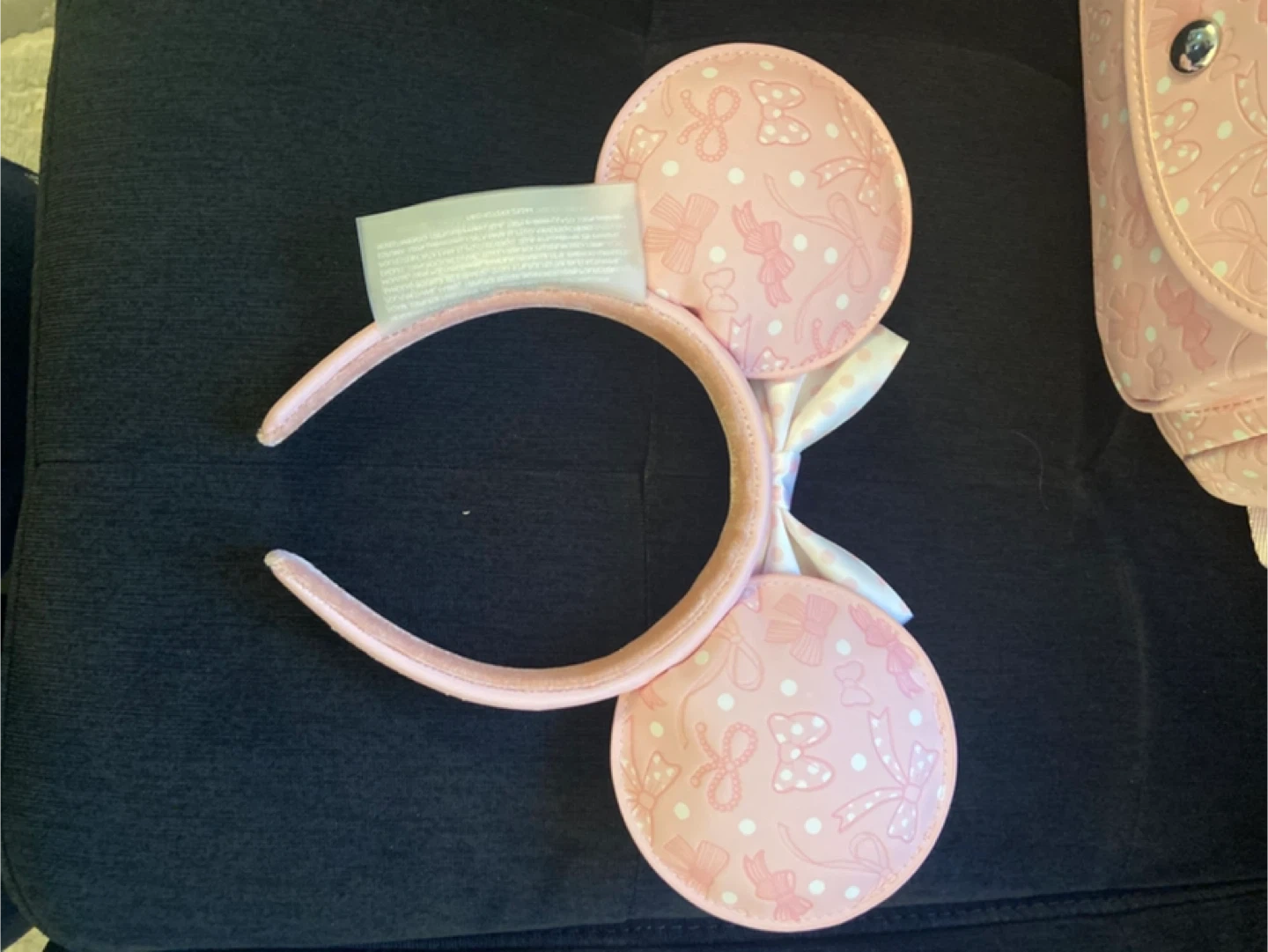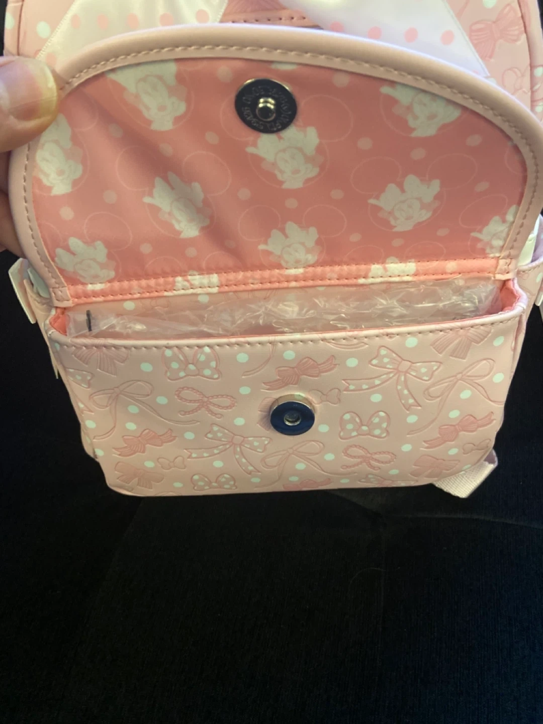 This is a Loungefly Disney Minnie Mouse backpack with matching ears in a lovely pink colour. It's adorned with a playful polka dot and bow pattern. Features adjustable shoulder straps for comfort. Never used. It is a bit too big for the intended user.