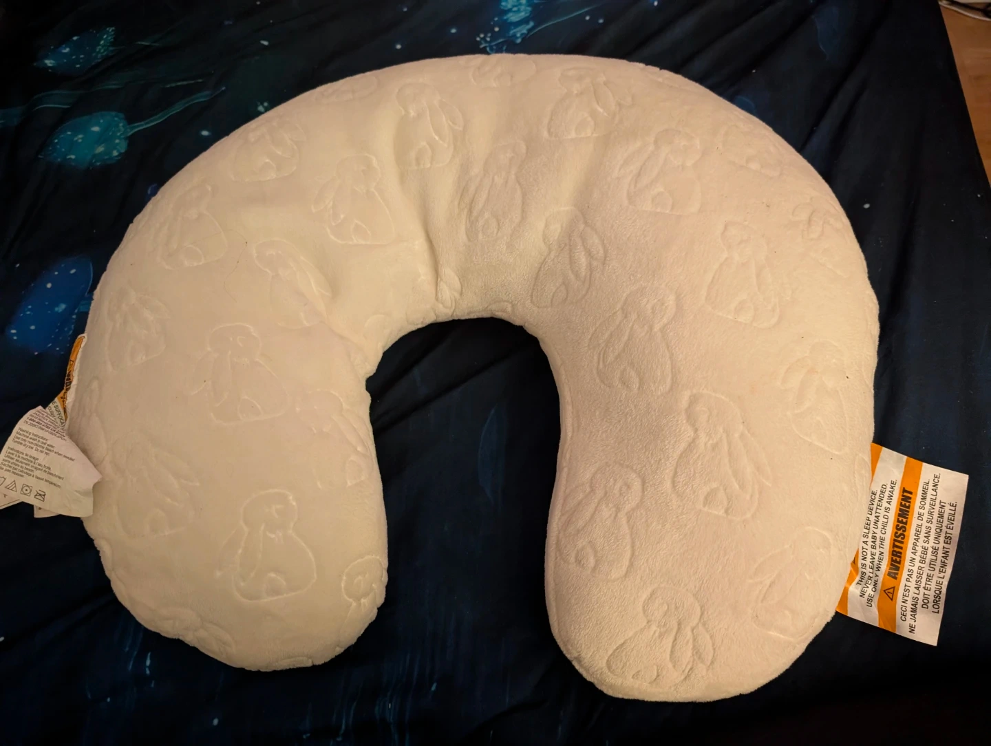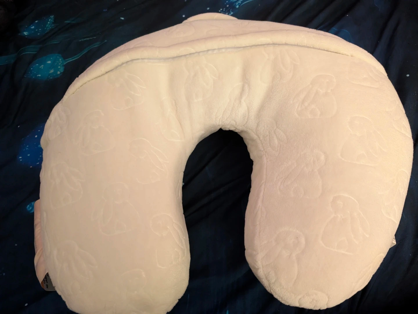 White nursing pillow with a cute embossed bunny pattern all over. It's soft and plush for comfortable feeding or support. The U-shape design cradles your baby. Great for nursing moms!