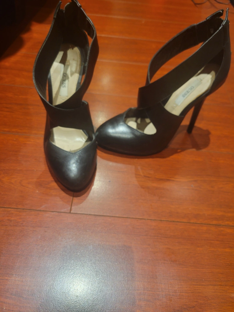 Black Guess heels with a zipper up the back and an interesting criss-cross strap design. The heels are approximately 4 inches tall. Size 5 They're in good condition.