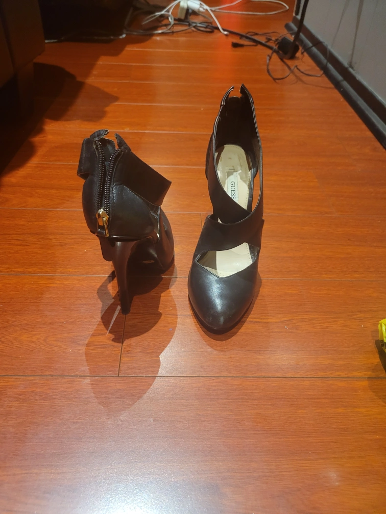 Black Guess heels with a zipper up the back and an interesting criss-cross strap design. The heels are approximately 4 inches tall. Size 5 They're in good condition.