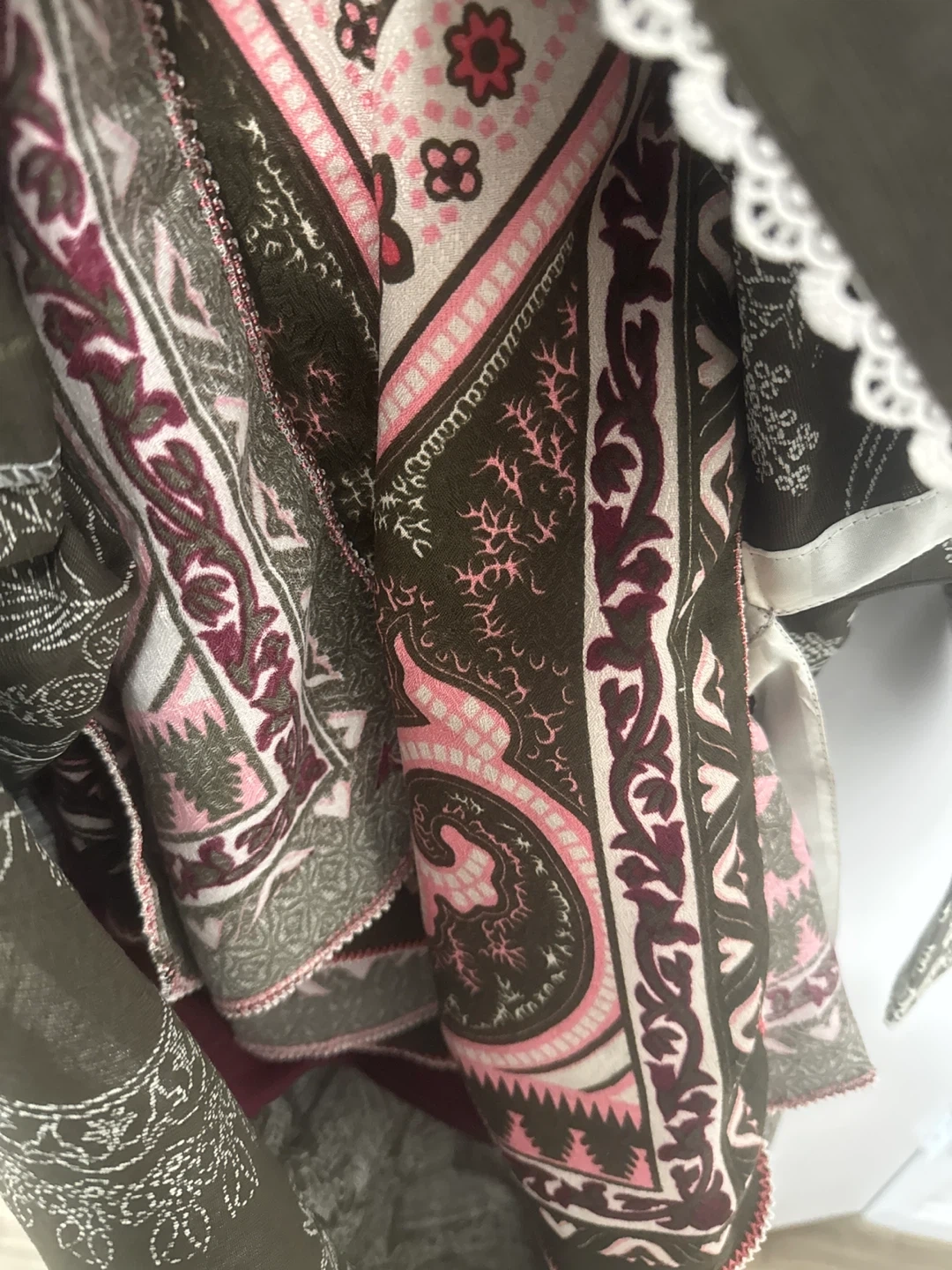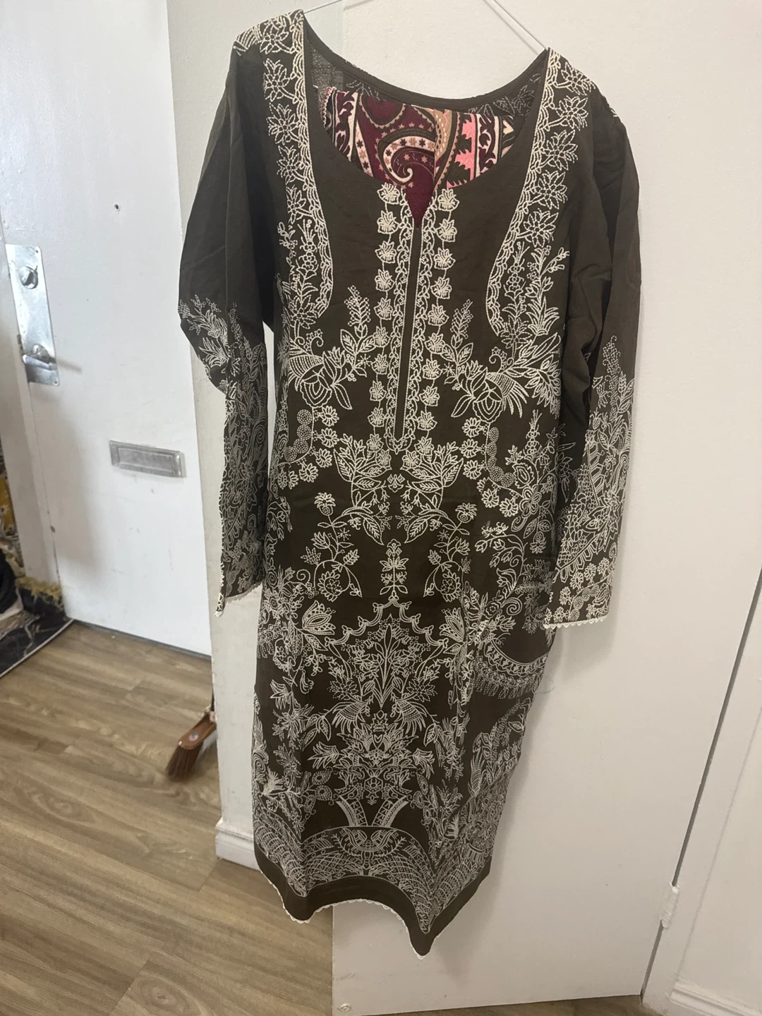 Green embroidered kurti top with intricate white floral patterns. It features a V-neckline and full sleeves. This stylish top is made of lightweight fabric.