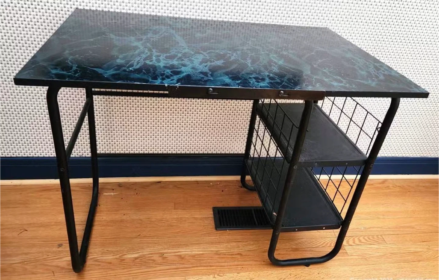 This is a vintage side table with a cool marble-look top. It has a black metal frame and two shelves. It's a neat piece for a smaller space!