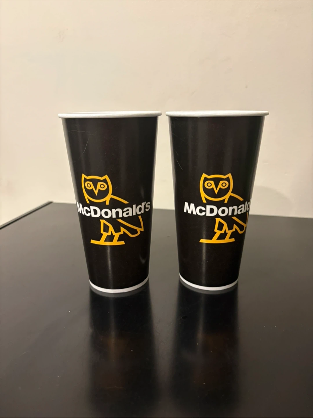 Two black paper cups featuring the McDonald's and OVO Owl collaboration logo. These cups are a cool collectible item for fans of both brands. Perfect for display or for enjoying a beverage!