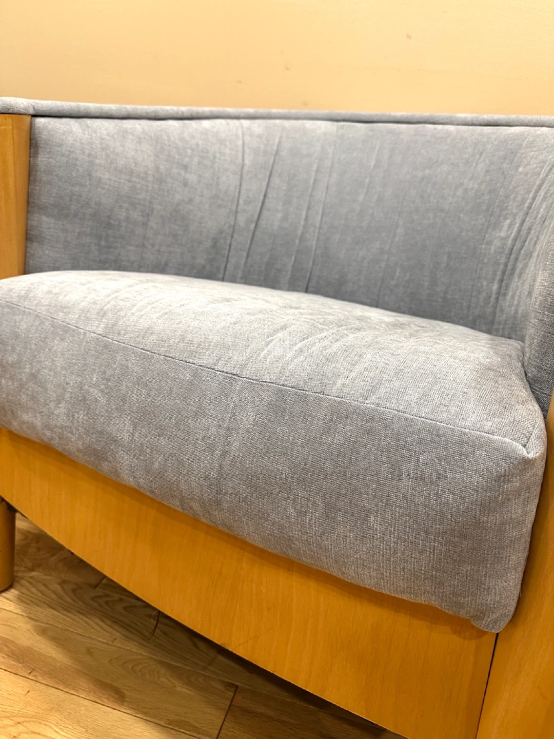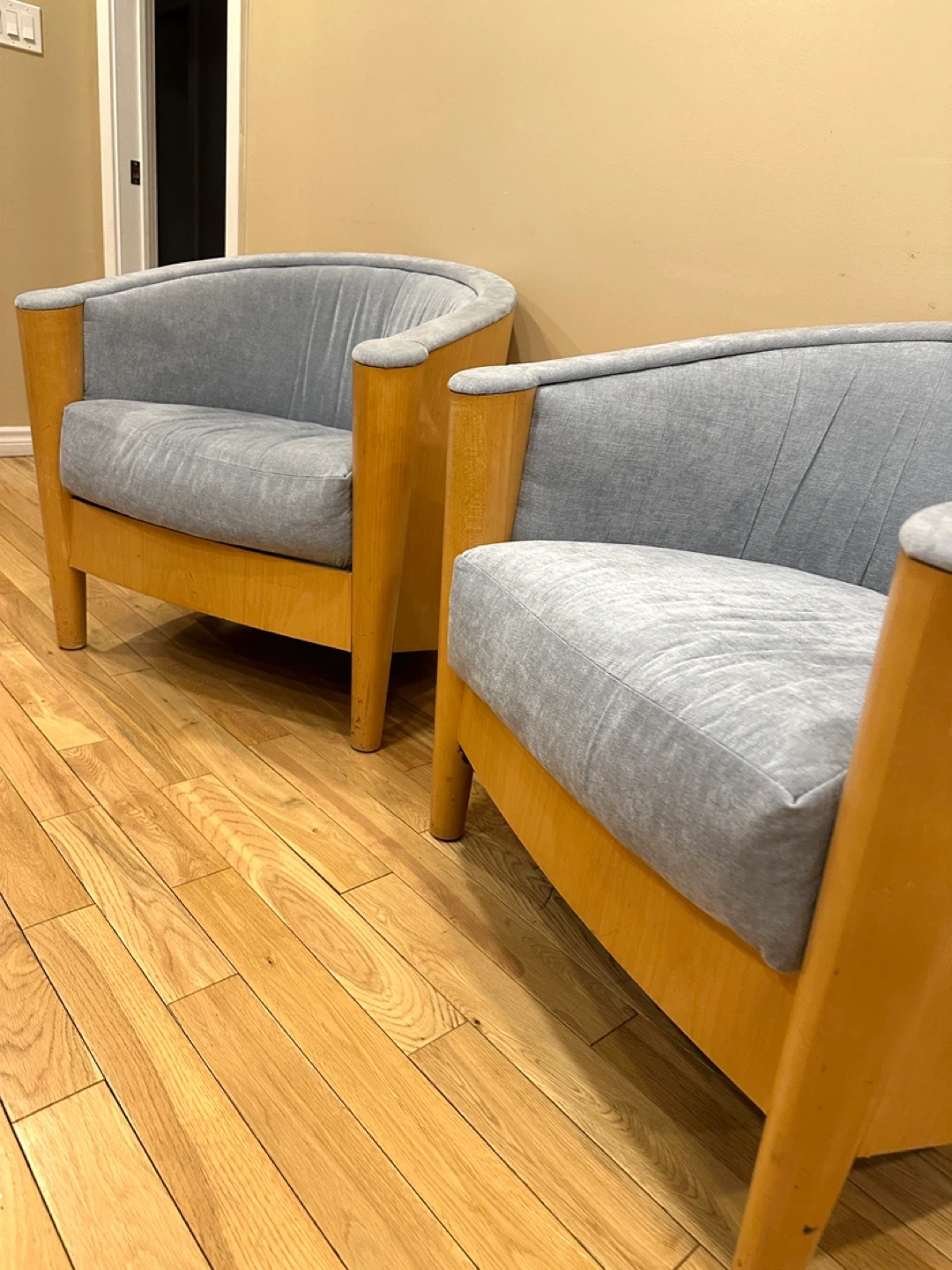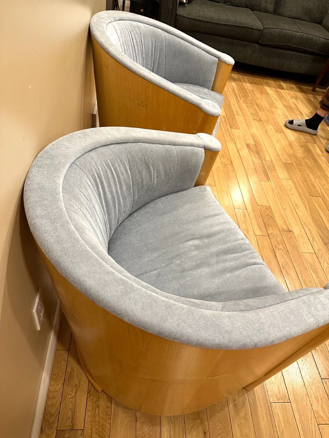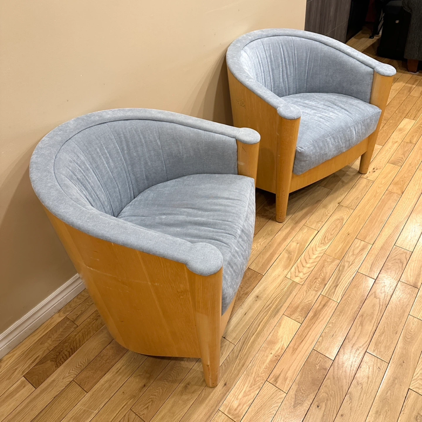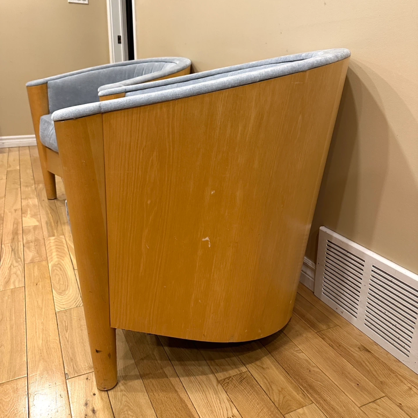 Pair of stylish vintage barrel lounge chairs with curved wood shell and soft grey blue upholstery. Comfortable, sturdy, and great as accent chairs for a living room, office, or reading space.