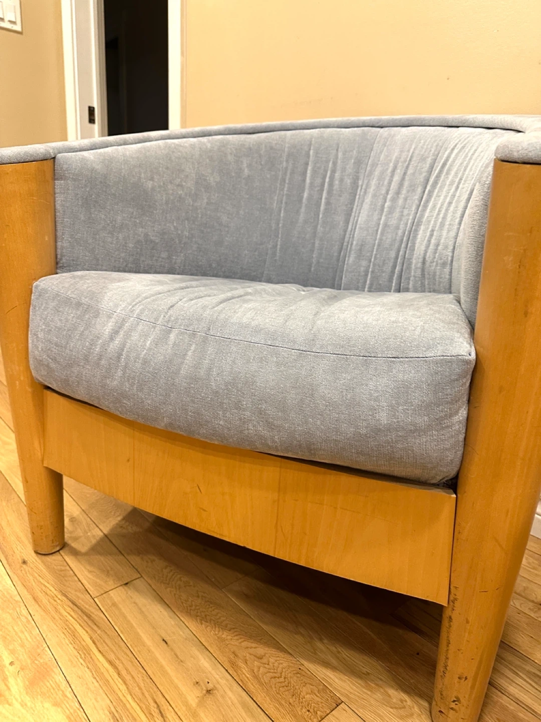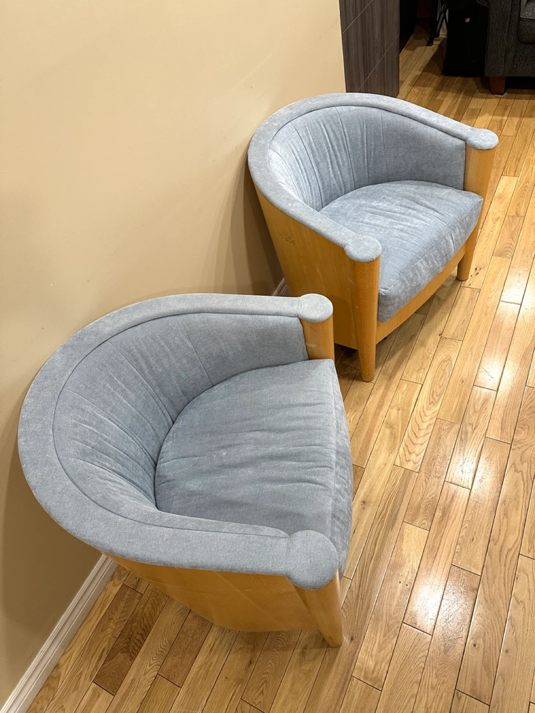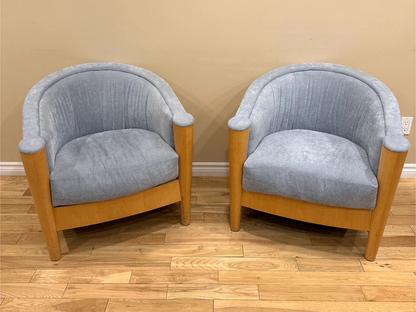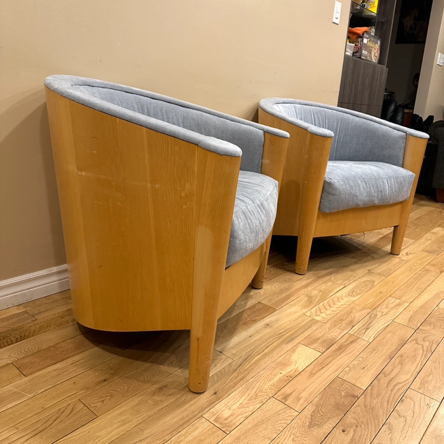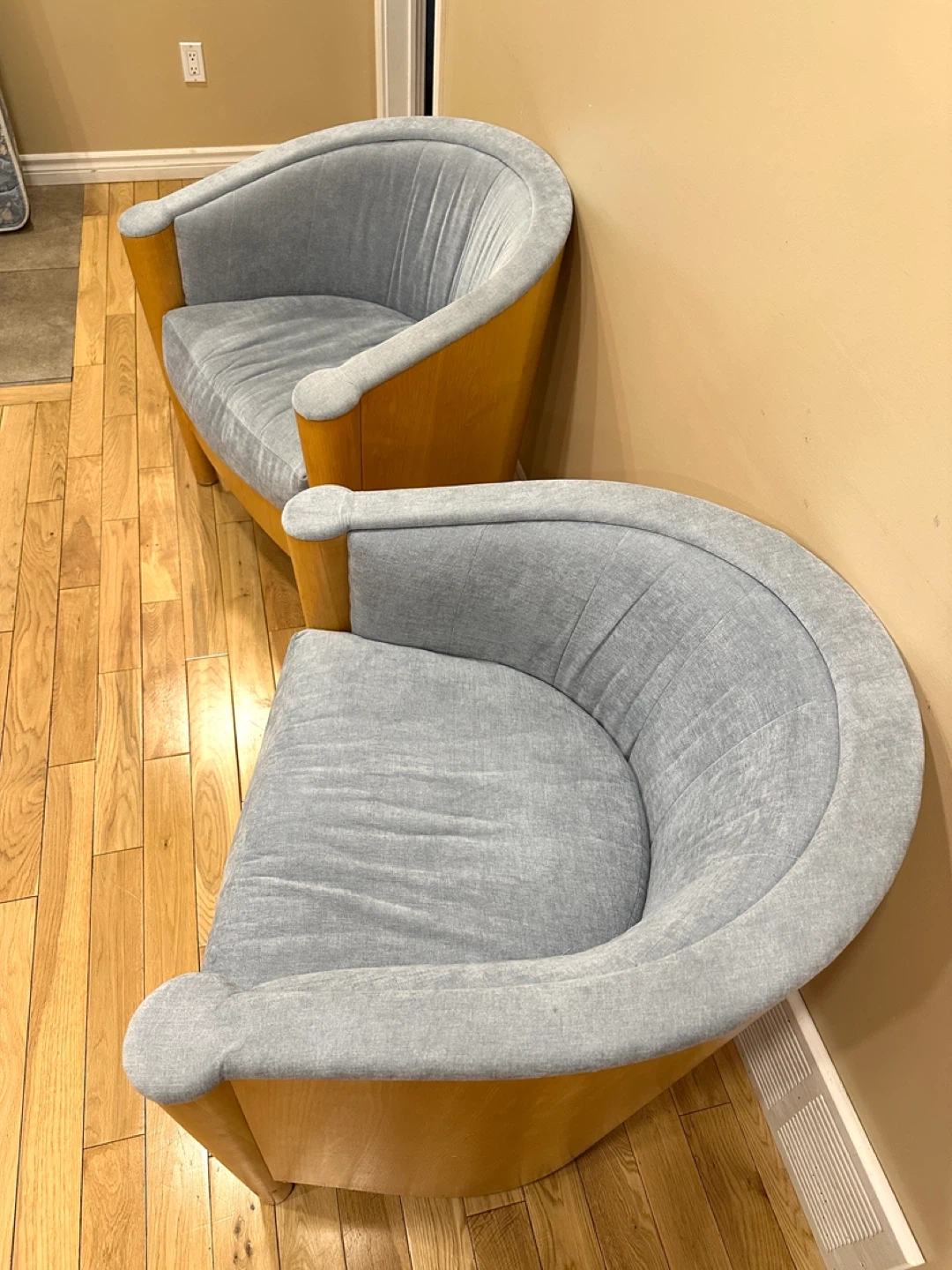Pair of stylish vintage barrel lounge chairs with curved wood shell and soft grey blue upholstery. Comfortable, sturdy, and great as accent chairs for a living room, office, or reading space.