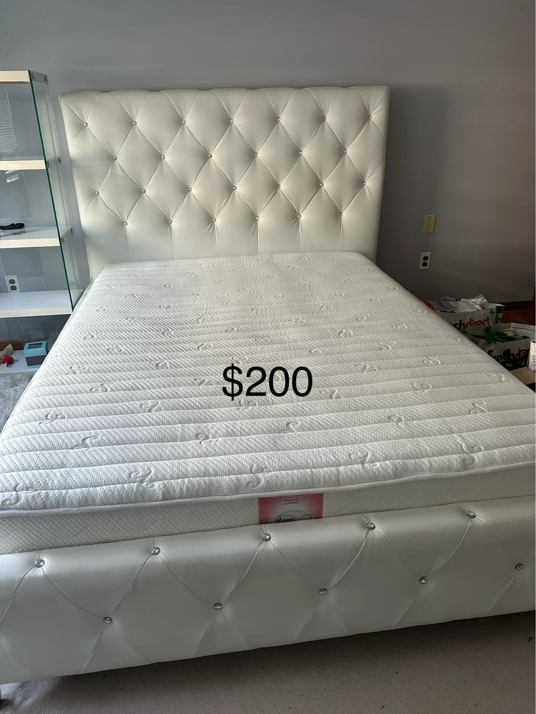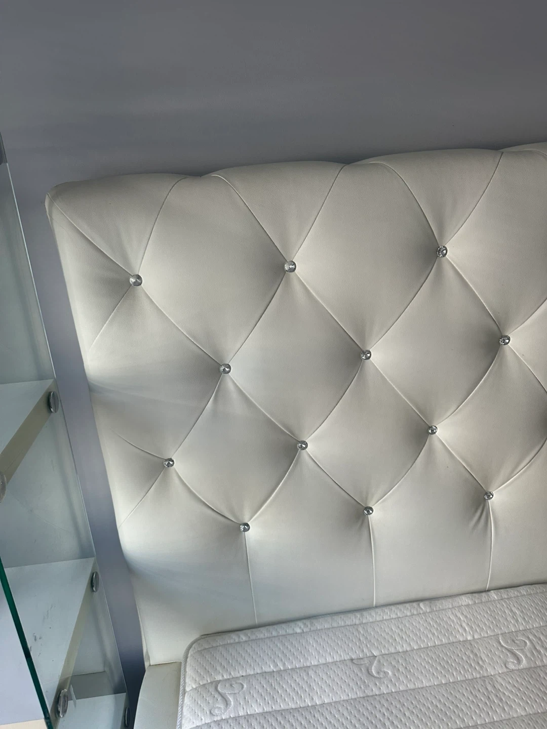 Cream/off white upholstered bed frame with diamond tufting and crystal button accents. Includes a white mattress with a subtle pattern. It's a stylish addition to any bedroom!
