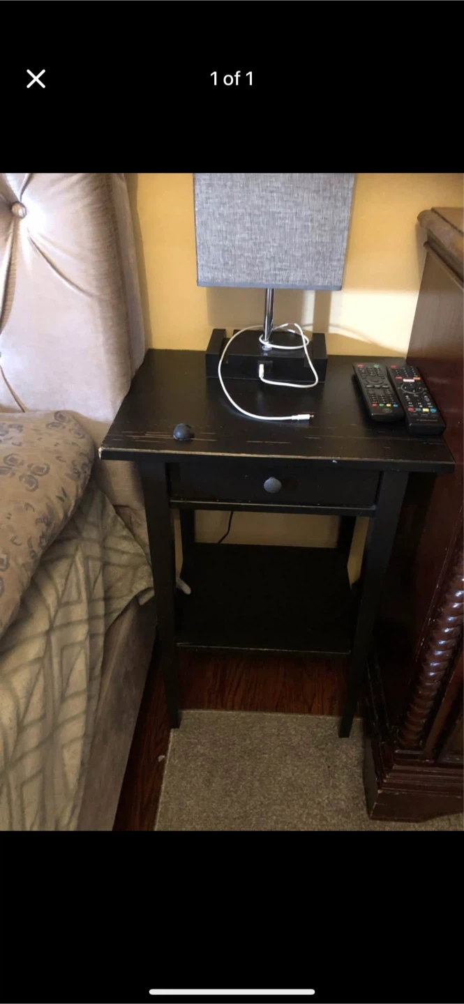 This is a black nightstand with a single drawer and an open shelf below. It's made of wood. The surface shows some wear. It's a handy piece for your bedroom!