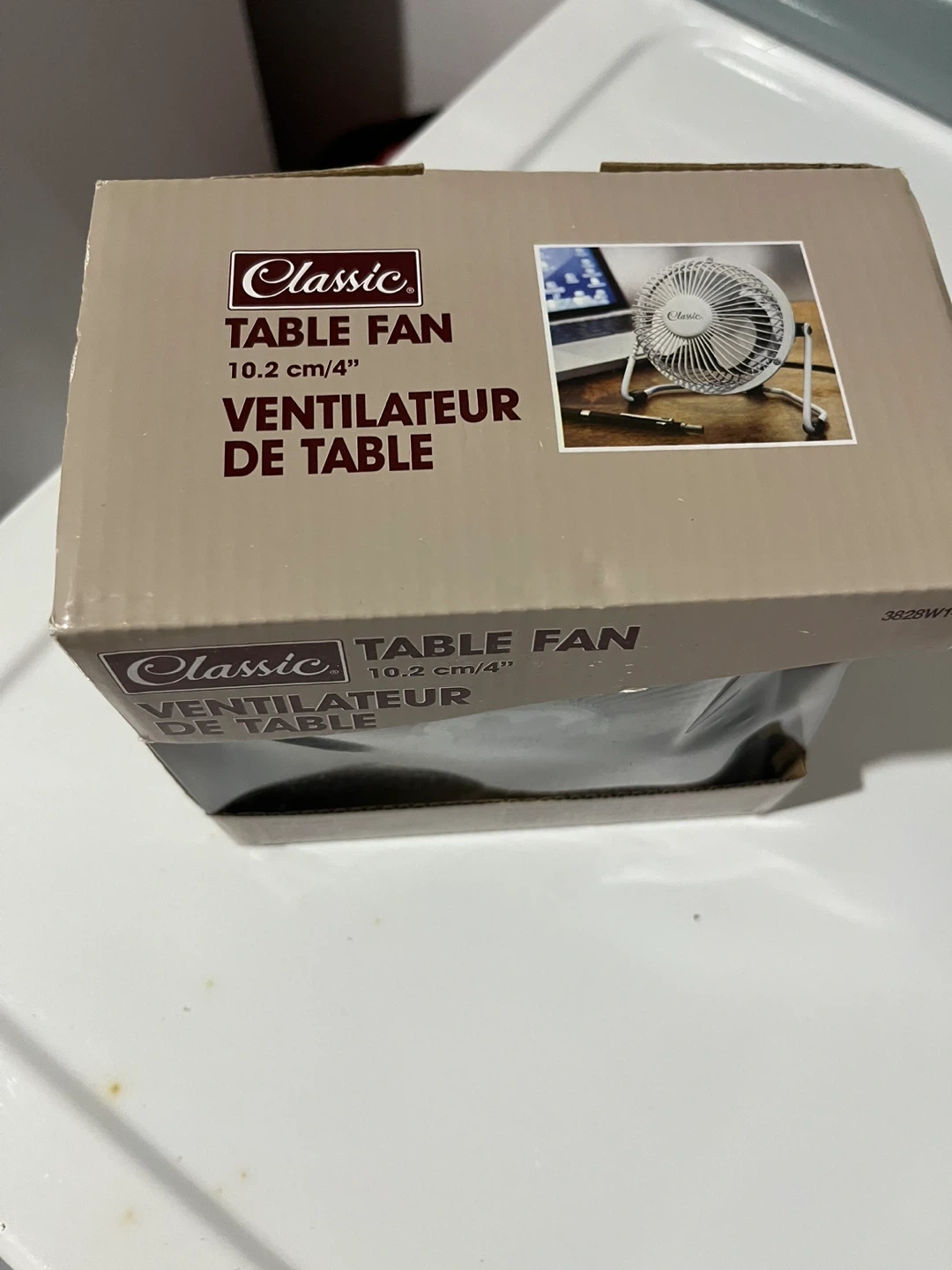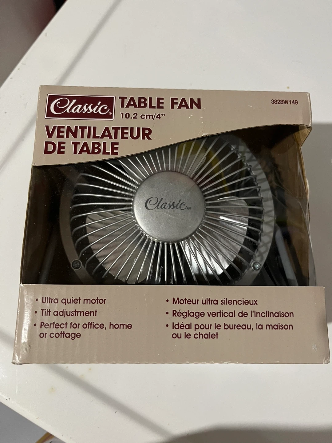 This Classic table fan is 10.2 cm or 4 inches in size. It features an ultra quiet motor and tilt adjustment. It's perfect for an office, home, or cottage.