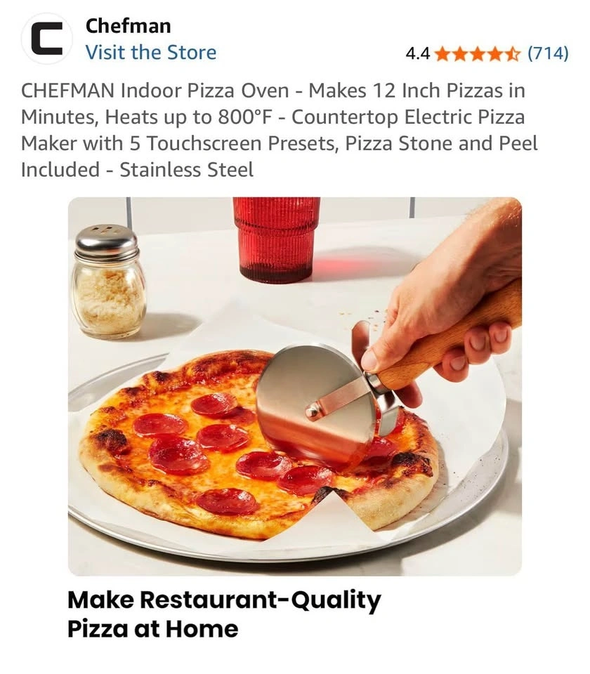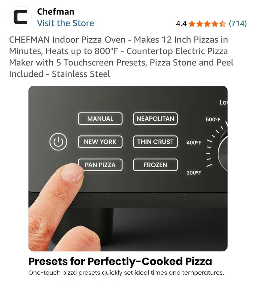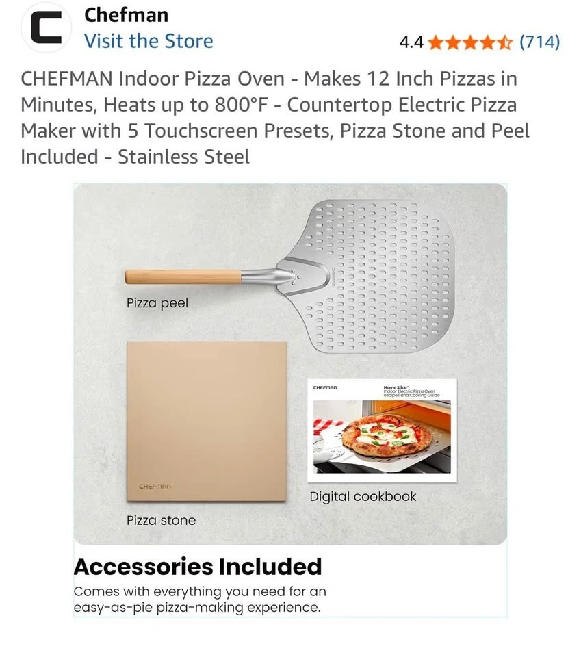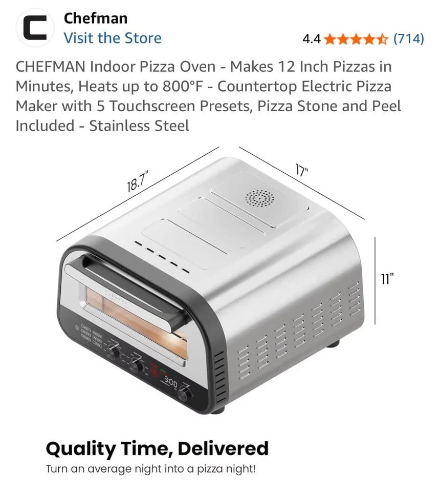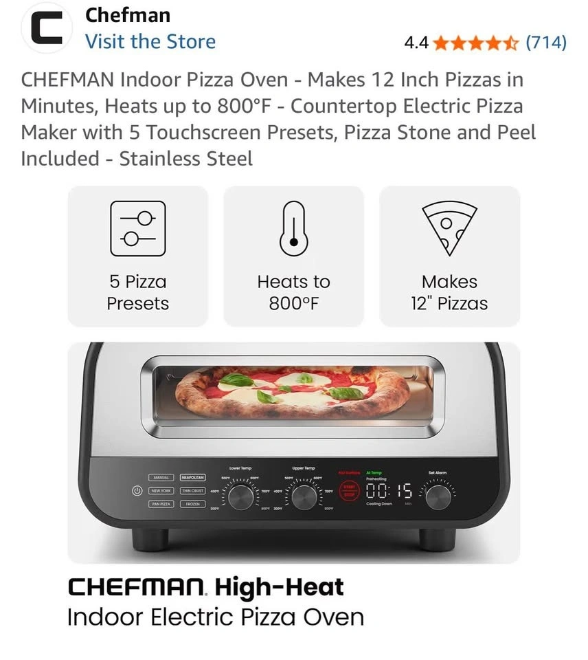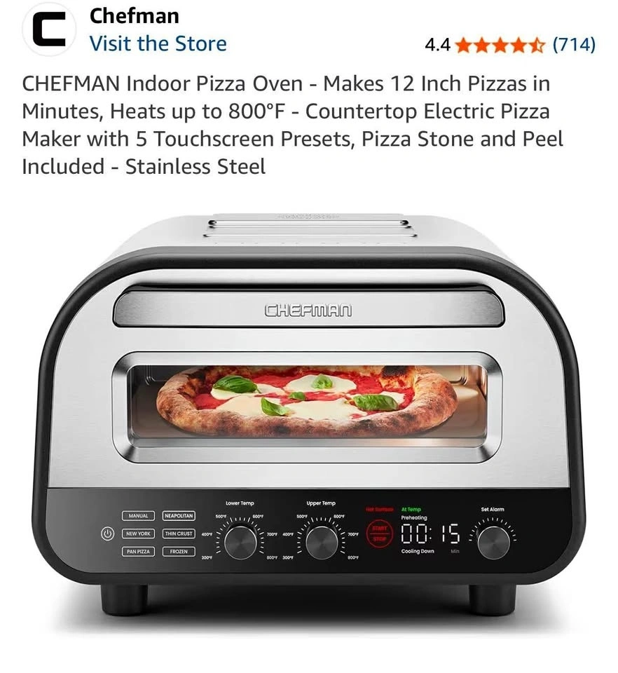 Brand new in the box! We're combining households and already have a pizza oven, so this one was an extra housewarming gift. It's a Chefman stainless steel pizza oven with a programmable touchscreen and 6 presets for different pizza styles (Neapolitan, New York, Thin-Crust, Pan, Frozen, DIY). It heats up to 800°F for quick, restaurant-quality pizza. It's compact for countertop use and includes a pizza stone, peel, and cookbook. We're happy for you to inspect and test it before you take it home to make sure you're satisfied. Once you pick it up, we can't be responsible for it.