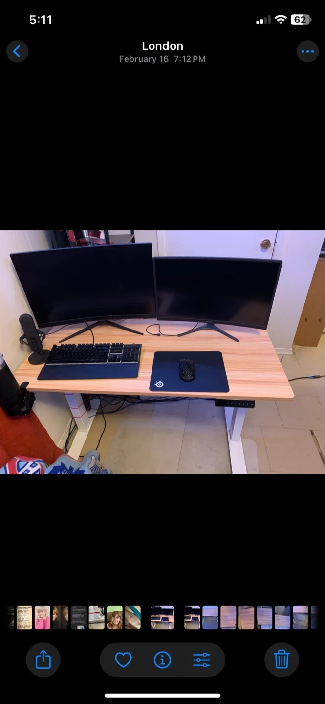 This is an electric standing desk with a light wood finish. It has a white metal frame and can be adjusted to different heights.