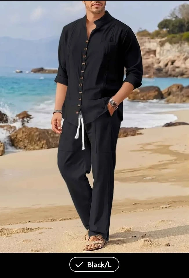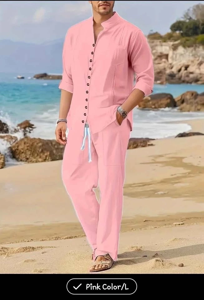 Blue, Pink, and Black Large size Men's Cotton Cuban Style Casual Set. Trendy Two-Piece Suit. Located near Lakeshore and Thirteenth Street.