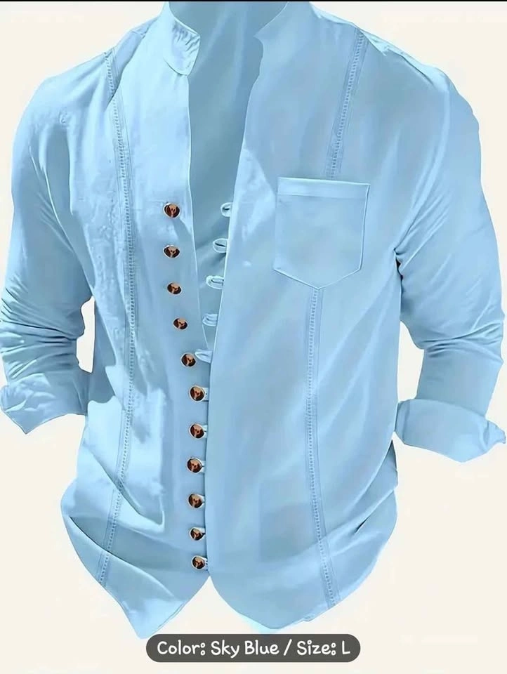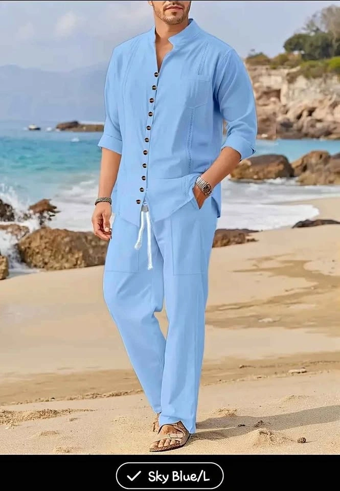 Blue, Pink, and Black Large size Men's Cotton Cuban Style Casual Set. Trendy Two-Piece Suit. Located near Lakeshore and Thirteenth Street.