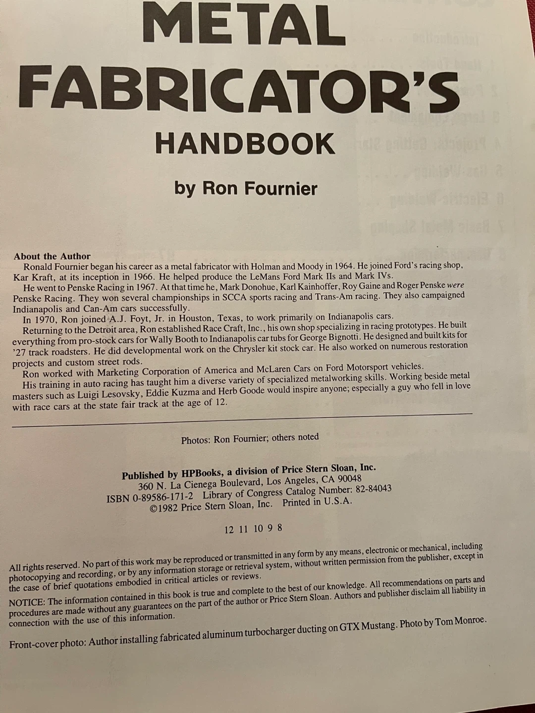 Selling a copy of "Metal Fabricator's Handbook" by Ron Fournier. It's a guide covering metalworking tools and techniques, including MIG and TIG arc and gas-welding. Perfect for anyone interested in race and custom car restoration, fenders, scoops, and spoilers. The book also includes practical data, formulas, and instructions. Cash only