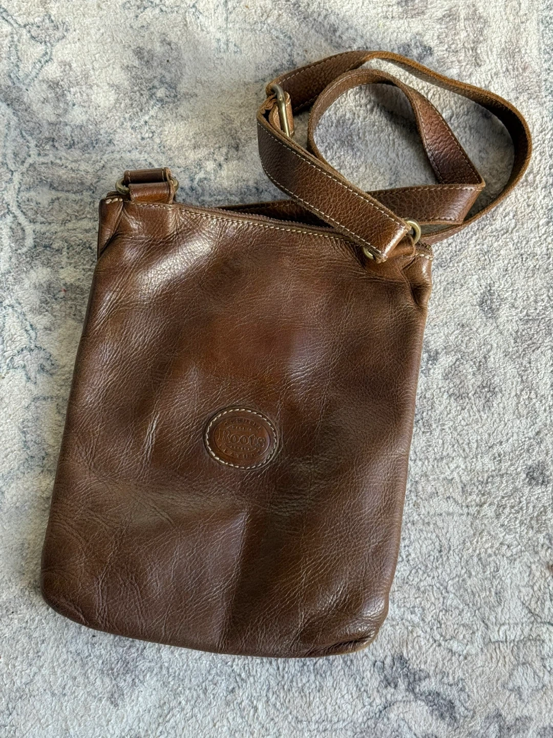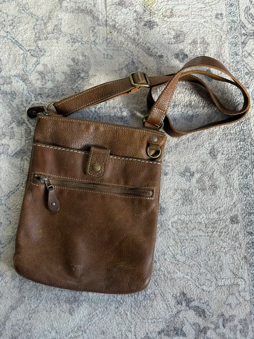 This is a brown leather crossbody bag by Roots. It features a main zippered compartment with an interior pocket, and a front zippered pocket. Made in Canada with genuine leather.