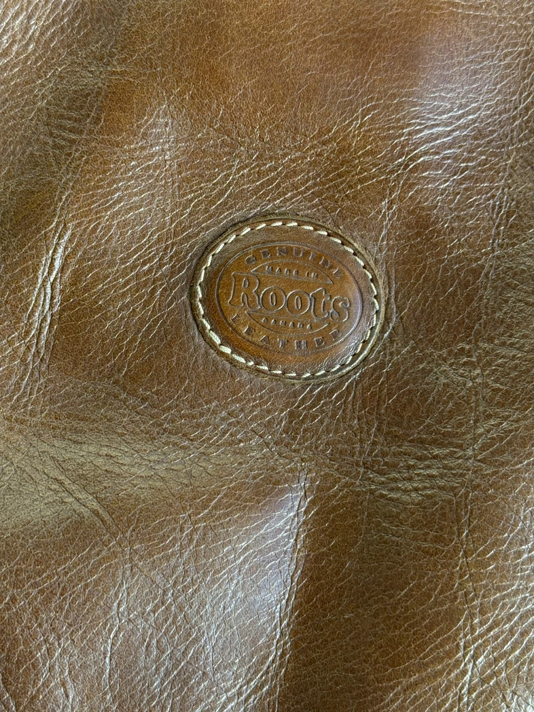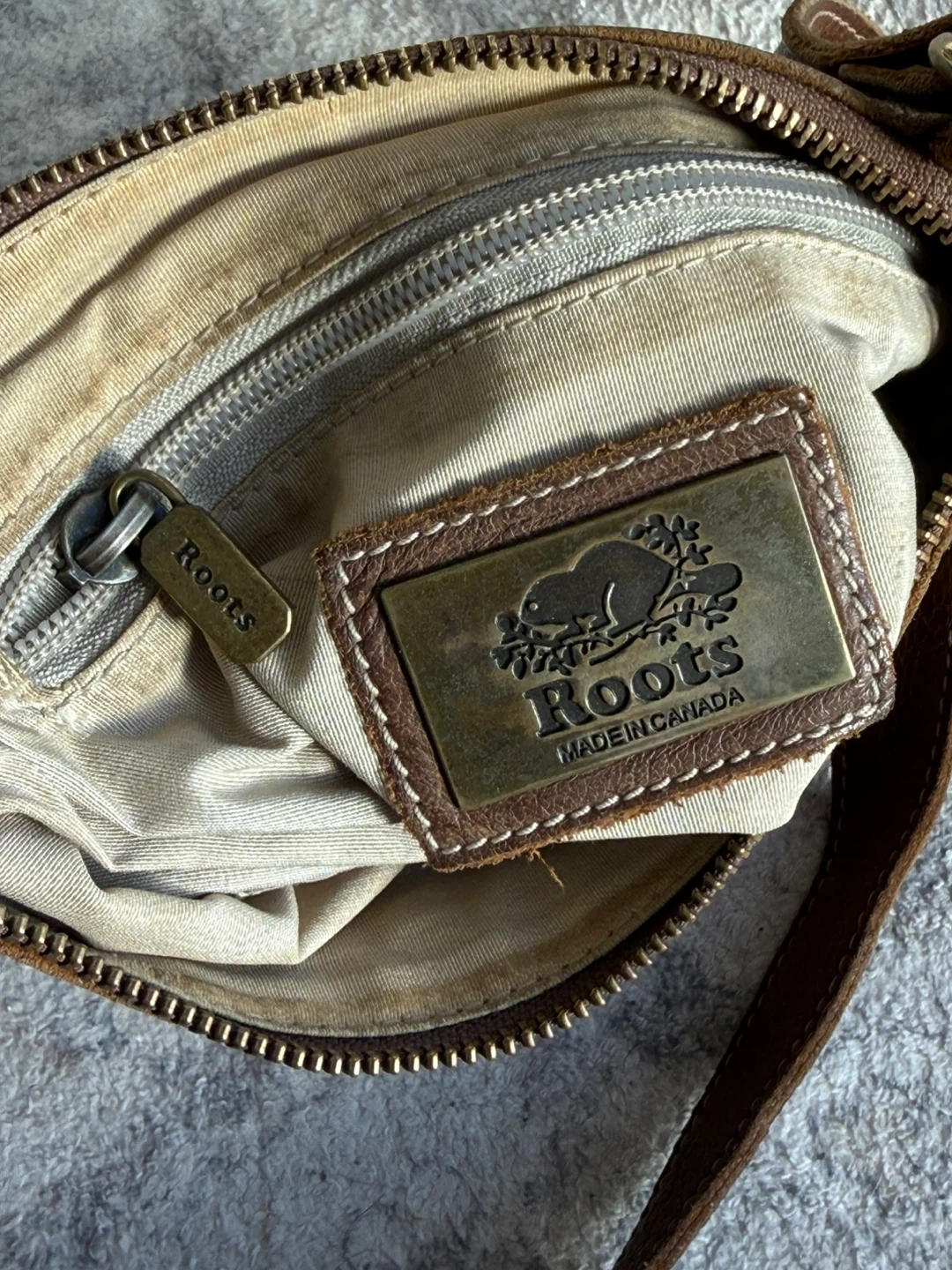 This is a brown leather crossbody bag by Roots. It features a main zippered compartment with an interior pocket, and a front zippered pocket. Made in Canada with genuine leather.
