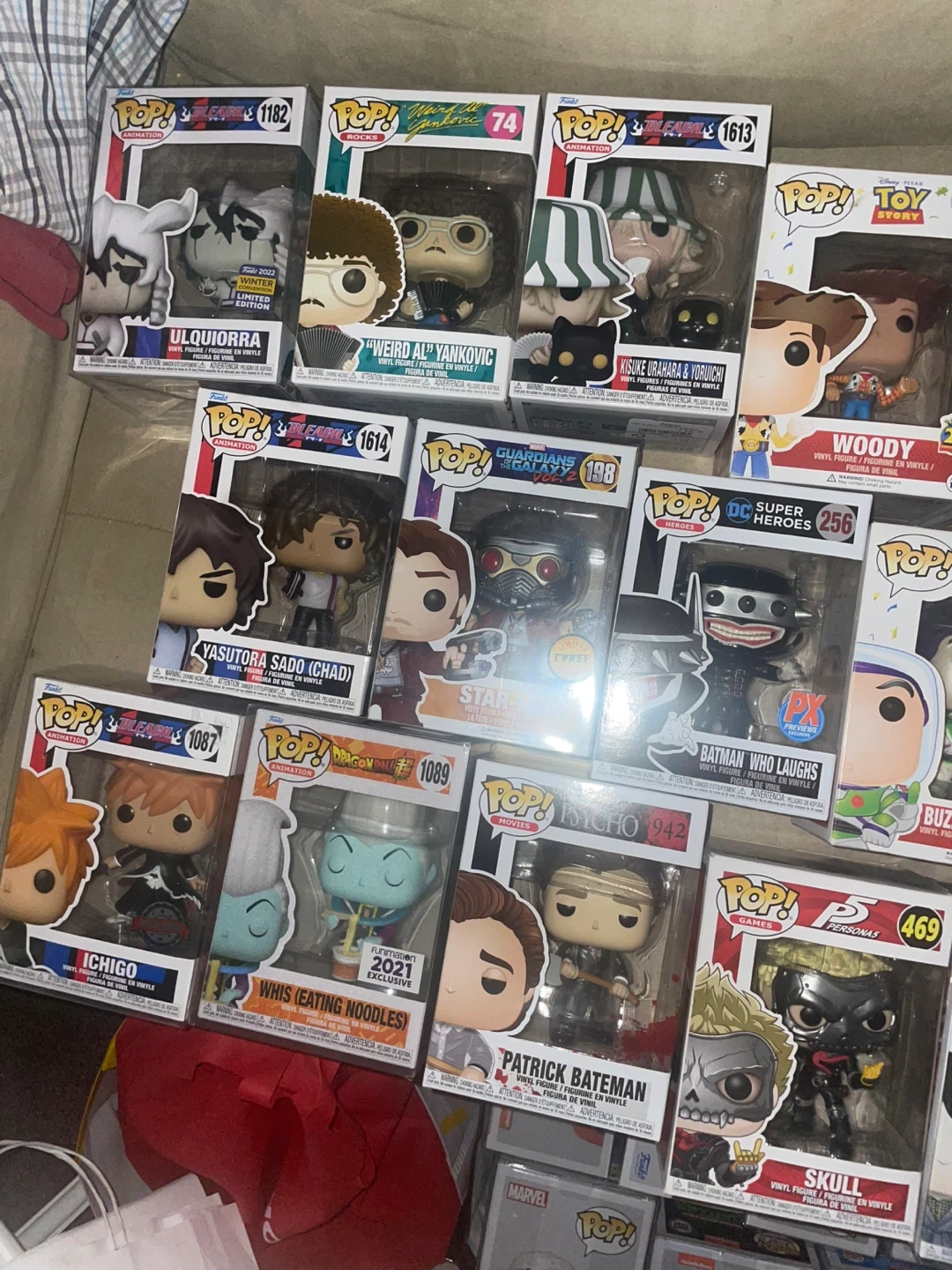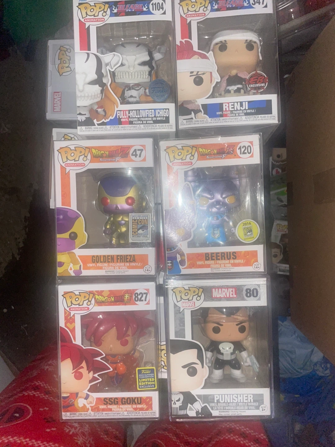 Collection of Funko Pop! vinyl figures from various franchises like Anime, Movies, NBA, and Music. Figures include characters such as Ichigo, Golden Frieza, Agent Smith, and John Wick. All figures are in original packaging.