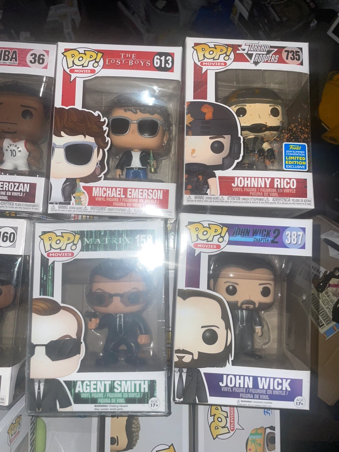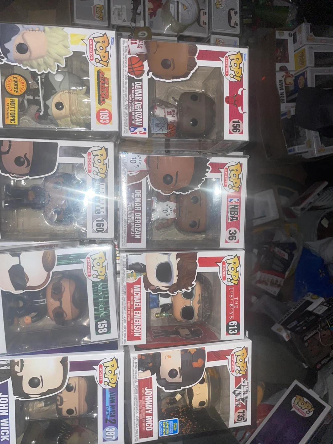 Collection of Funko Pop! vinyl figures from various franchises like Anime, Movies, NBA, and Music. Figures include characters such as Ichigo, Golden Frieza, Agent Smith, and John Wick. All figures are in original packaging.