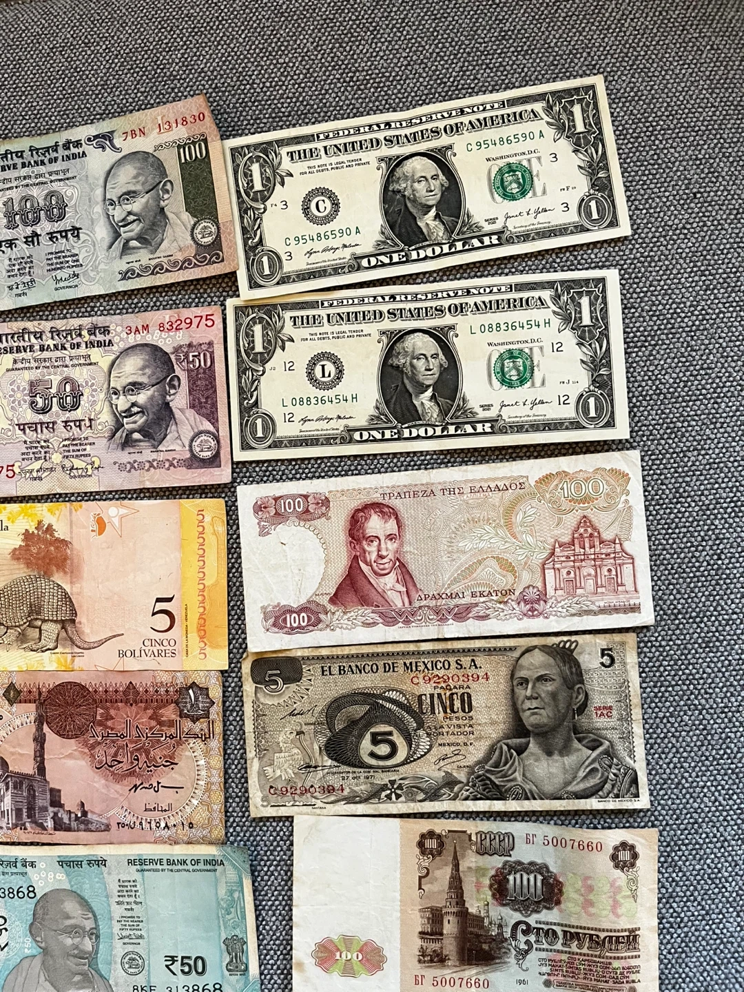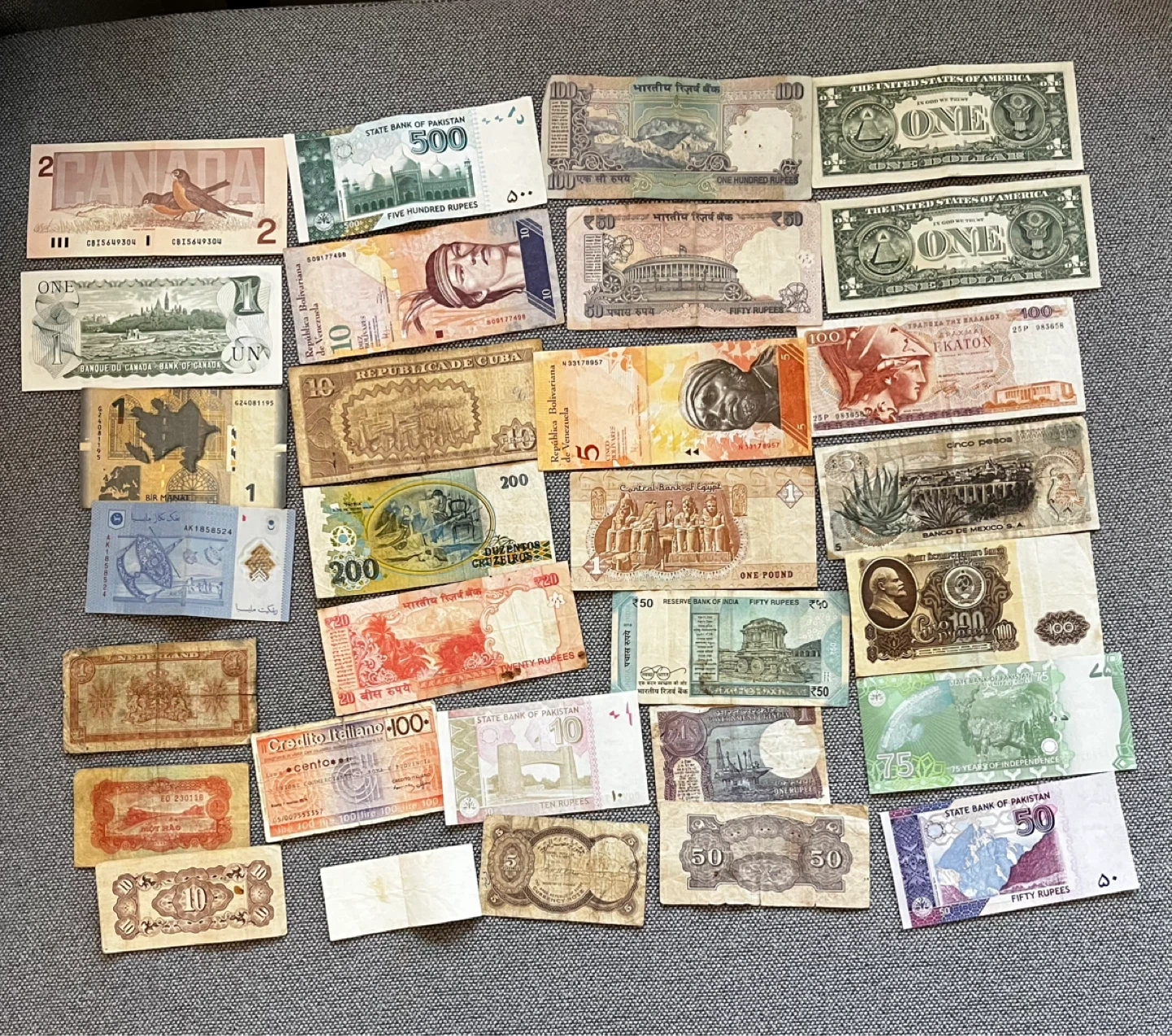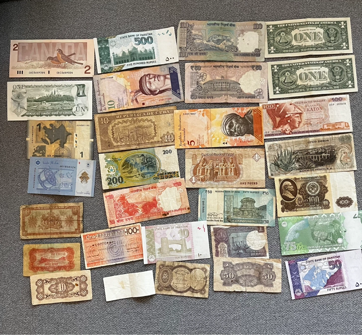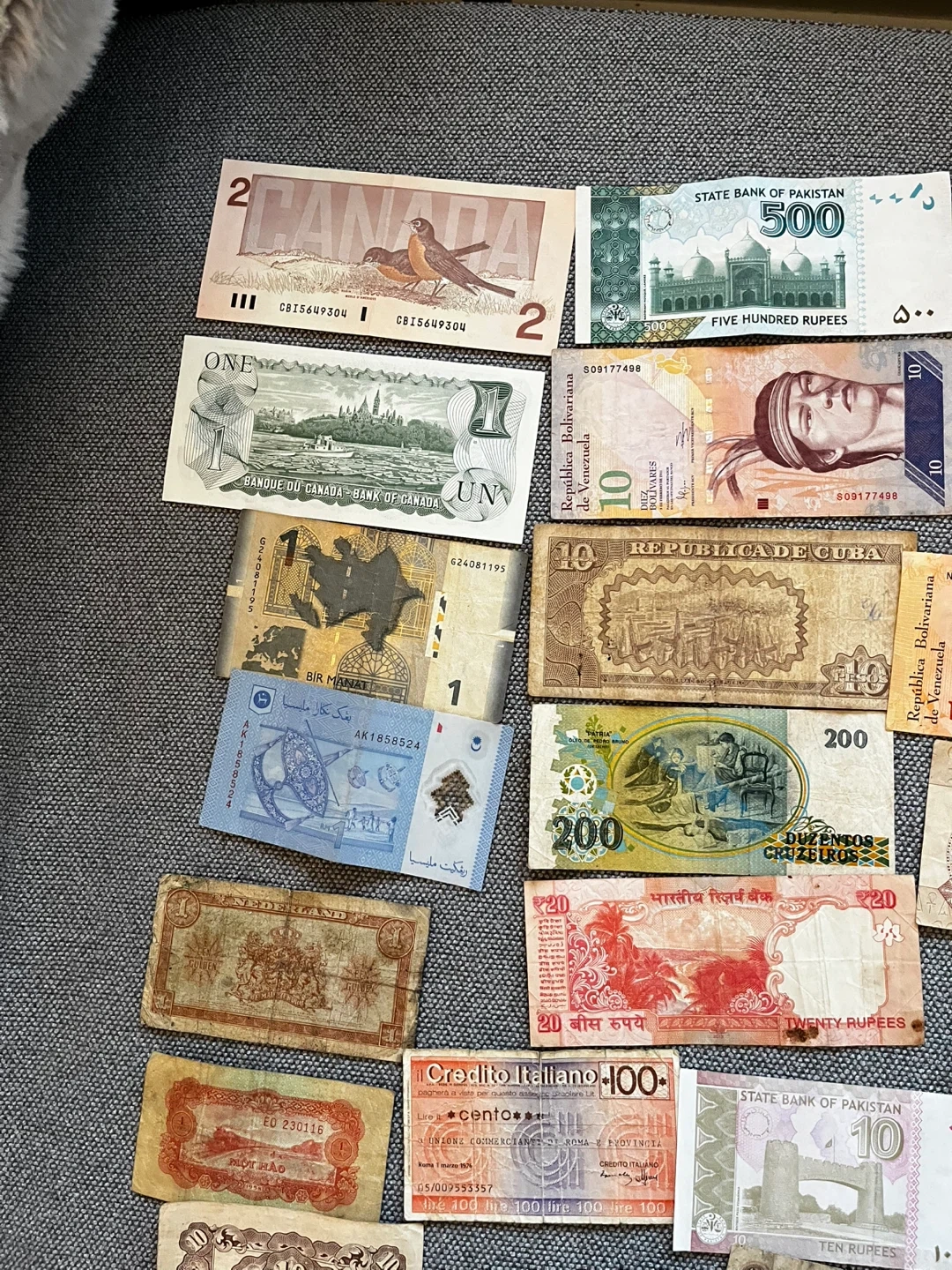 Every Single note more information about world ๐ This is a collection of various international banknotes. It includes currency from Canada, the United States, Pakistan, India, Cuba, Venezuela, Brazil, Mexico, and Japan. The bills vary in denomination and age.