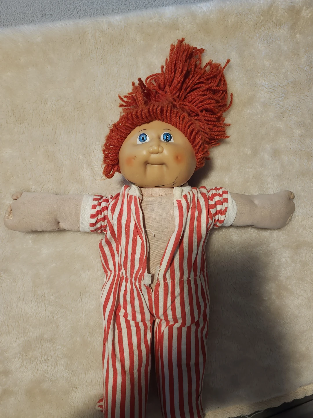 This is a vintage Cabbage Patch Kid doll with bright red yarn hair and blue eyes. It's wearing a red and white striped jumpsuit. The doll's limbs and body are soft, fabric-filled.