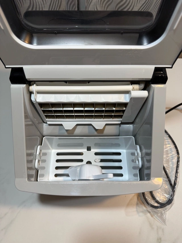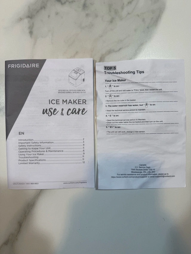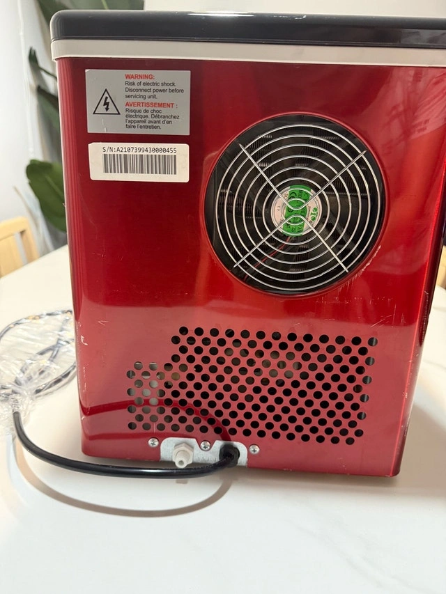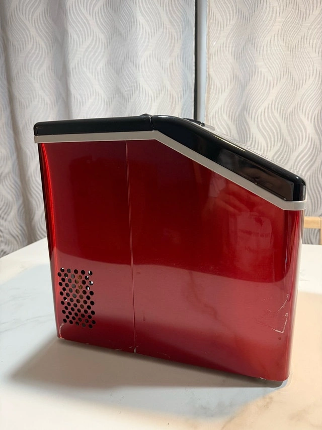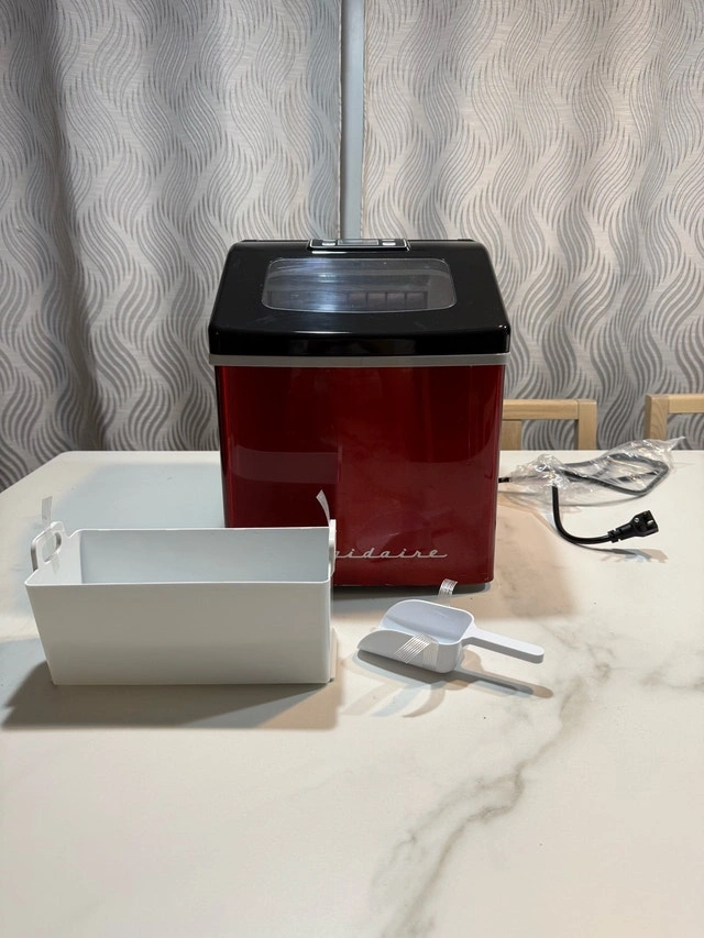 This Frigidaire ice maker is in good condition with some minor paint wear on the body, as shown in the photos. It works perfectly with no issues. Model: EFIC452-SSRED. Colour: Red Stainless Steel. Ice Production: Up to 40 lbs per day. Ice Type: Clear Square Ice Cubes. Water Tank Capacity: 2.3 qt. Ice Basket Capacity: 2.4 lbs. Power: 120W. Voltage: 120V. This countertop ice maker produces clear, restaurant-style square ice cubes and can make up to 24 cubes in less than 15 minutes. Its sleek stainless steel design looks great in any kitchen, bar, office, or dorm. The digital LCD control panel and transparent window make it easy to monitor and adjust settings. It also includes a drain plug for easy cleaning and an ice scoop for convenience. Cash accepted.