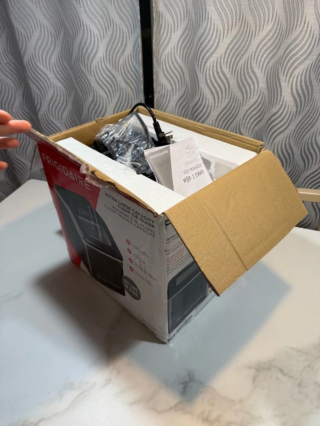 This Frigidaire ice maker is in good condition with some minor paint wear on the body, as shown in the photos. It works perfectly with no issues. Model: EFIC452-SSRED. Colour: Red Stainless Steel. Ice Production: Up to 40 lbs per day. Ice Type: Clear Square Ice Cubes. Water Tank Capacity: 2.3 qt. Ice Basket Capacity: 2.4 lbs. Power: 120W. Voltage: 120V. This countertop ice maker produces clear, restaurant-style square ice cubes and can make up to 24 cubes in less than 15 minutes. Its sleek stainless steel design looks great in any kitchen, bar, office, or dorm. The digital LCD control panel and transparent window make it easy to monitor and adjust settings. It also includes a drain plug for easy cleaning and an ice scoop for convenience. Cash accepted.