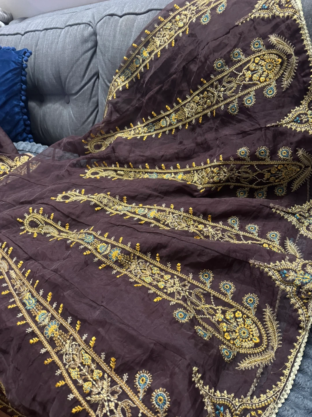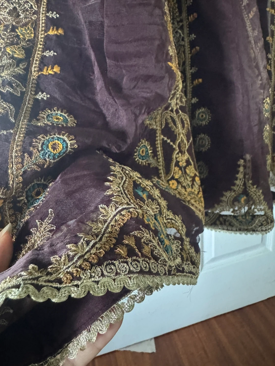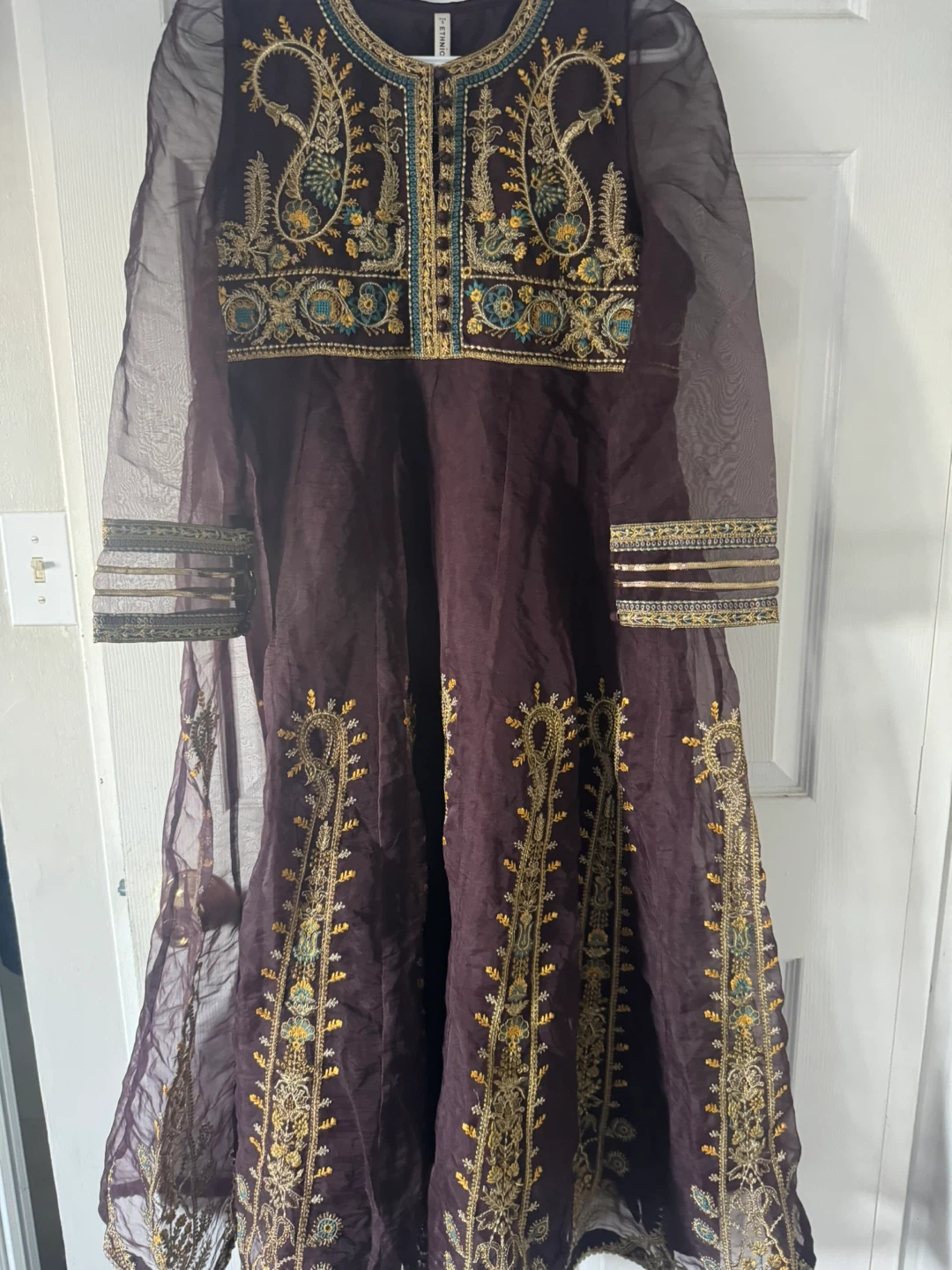 Beautiful embroidered dress flair dress from Ethnic by Outfitters. It features intricate gold and teal embroidery on a sheer, dark purple fabric. Perfect for a special occasion or adding a touch of elegance to your wardrobe!New With Tag