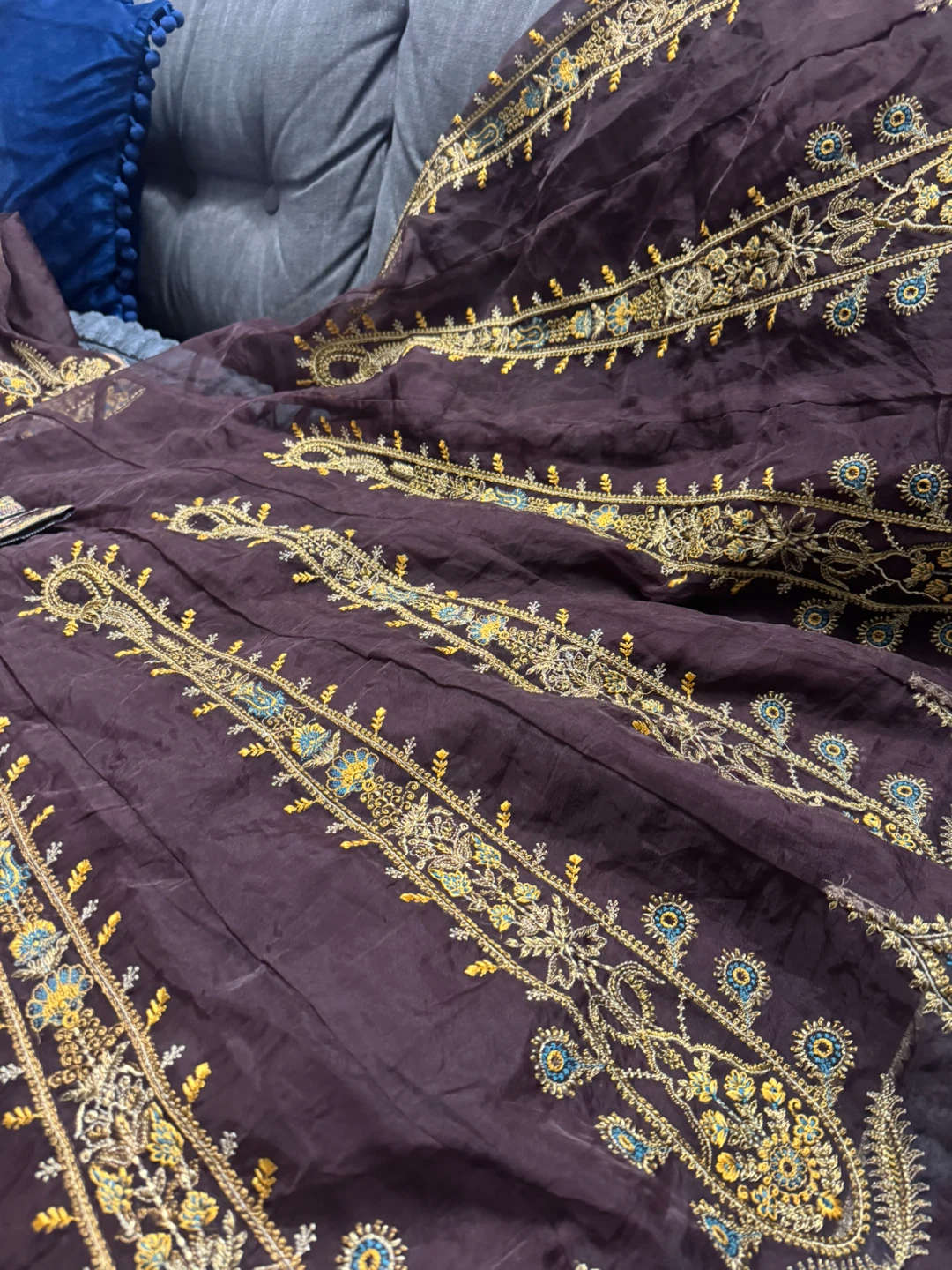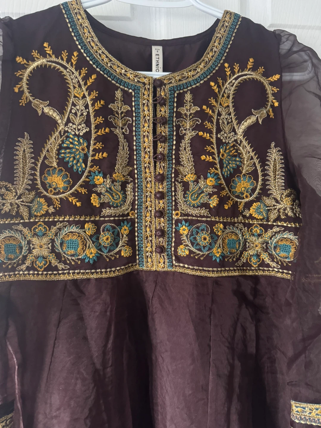 Beautiful embroidered dress flair dress from Ethnic by Outfitters. It features intricate gold and teal embroidery on a sheer, dark purple fabric. Perfect for a special occasion or adding a touch of elegance to your wardrobe!New With Tag