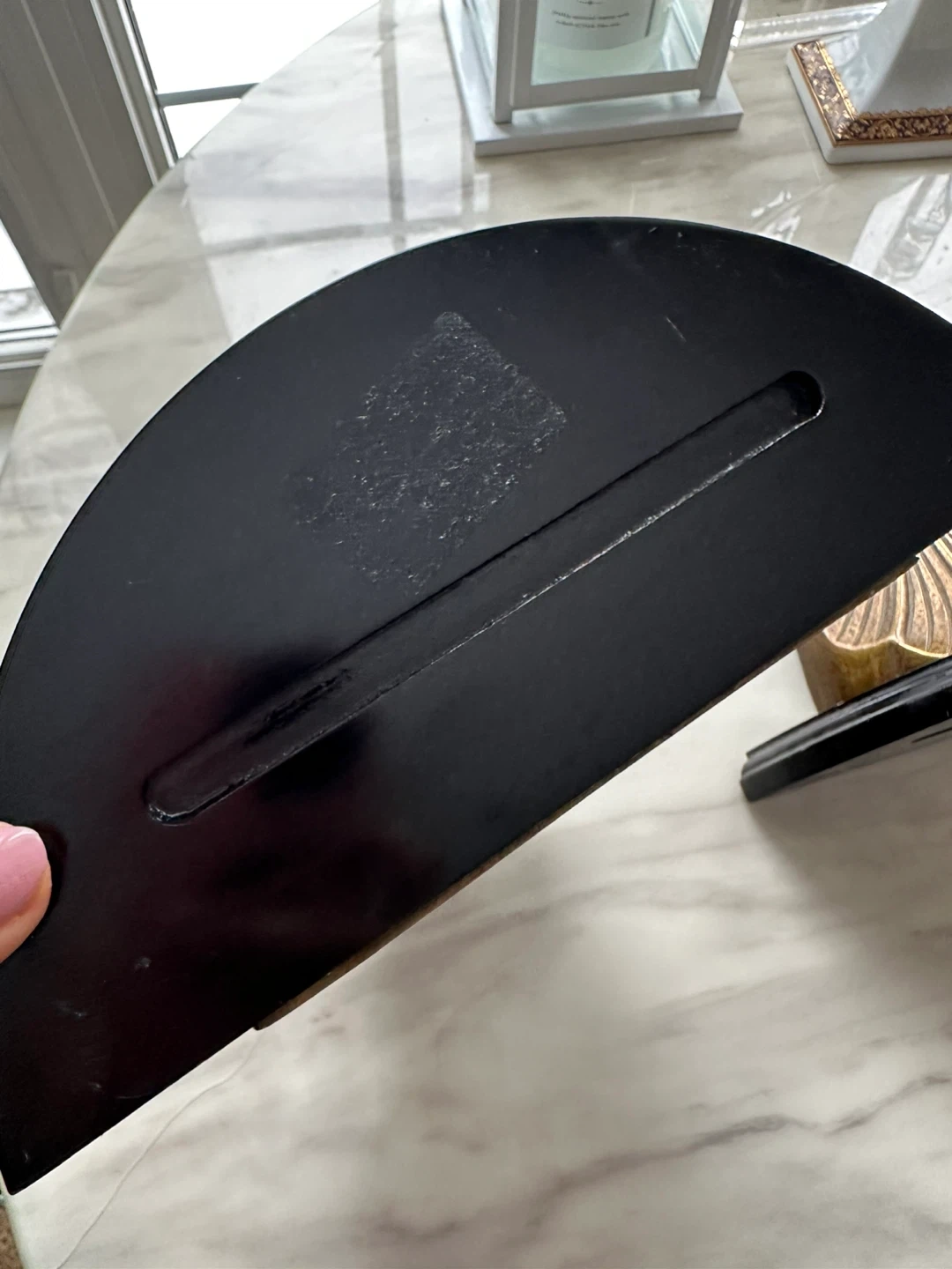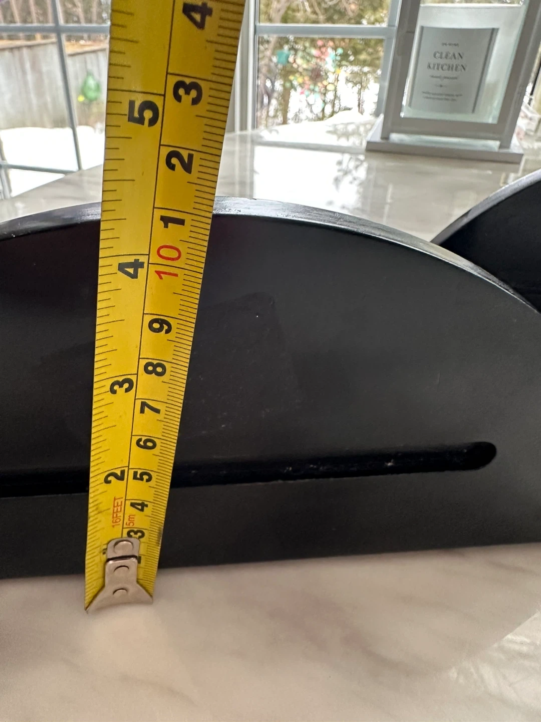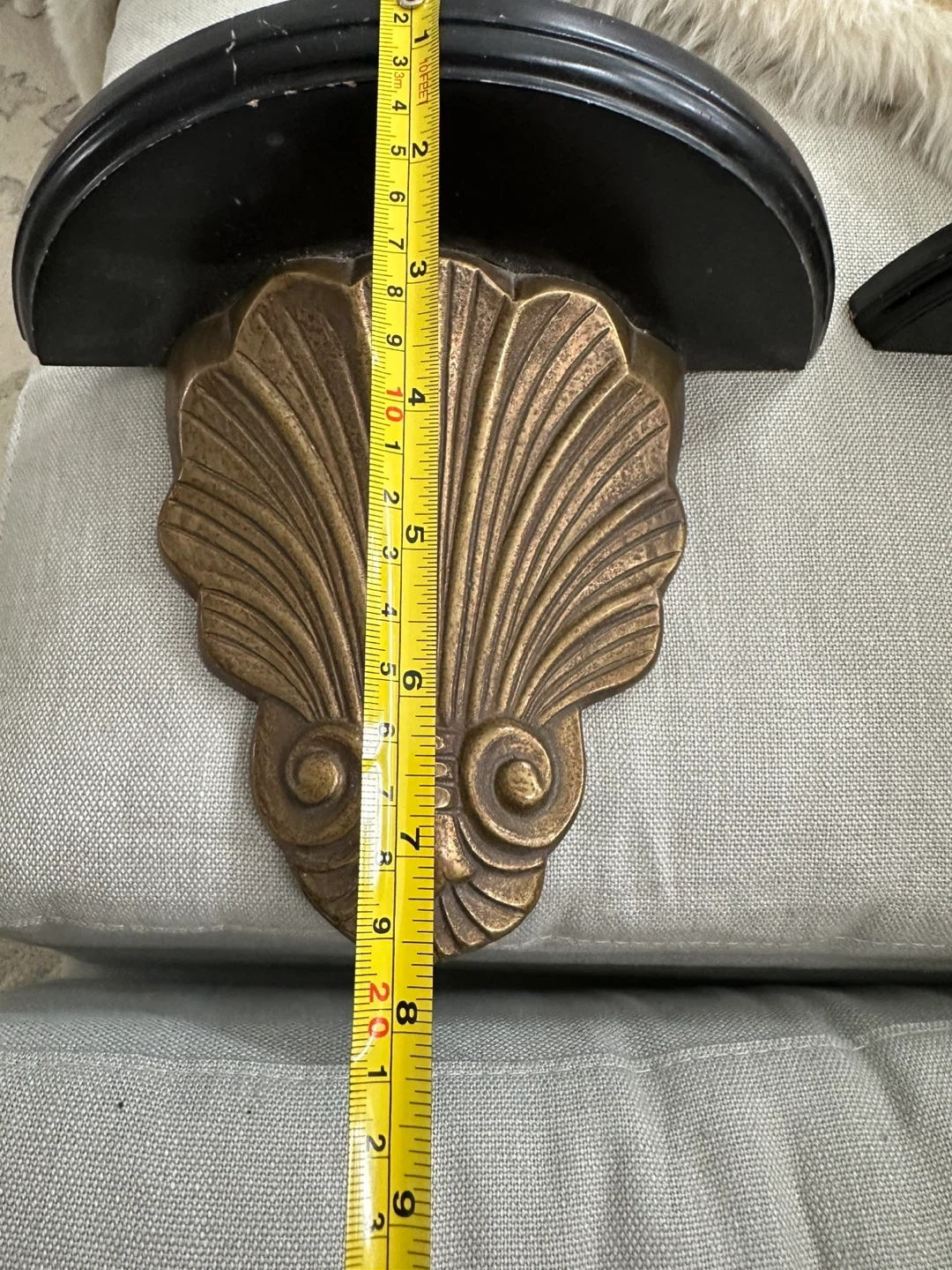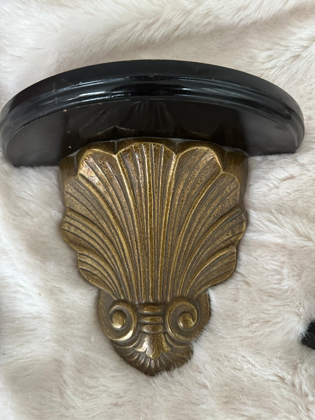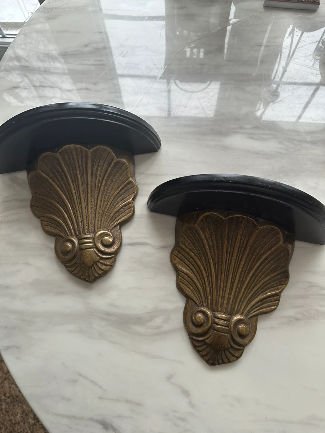 Set of two decorative wall shelves. Features a black wooden shelf with an ornate brass shell-shaped bracket. Each shelf measures approximately 7 inches tall. Perfect for displaying small decor items!