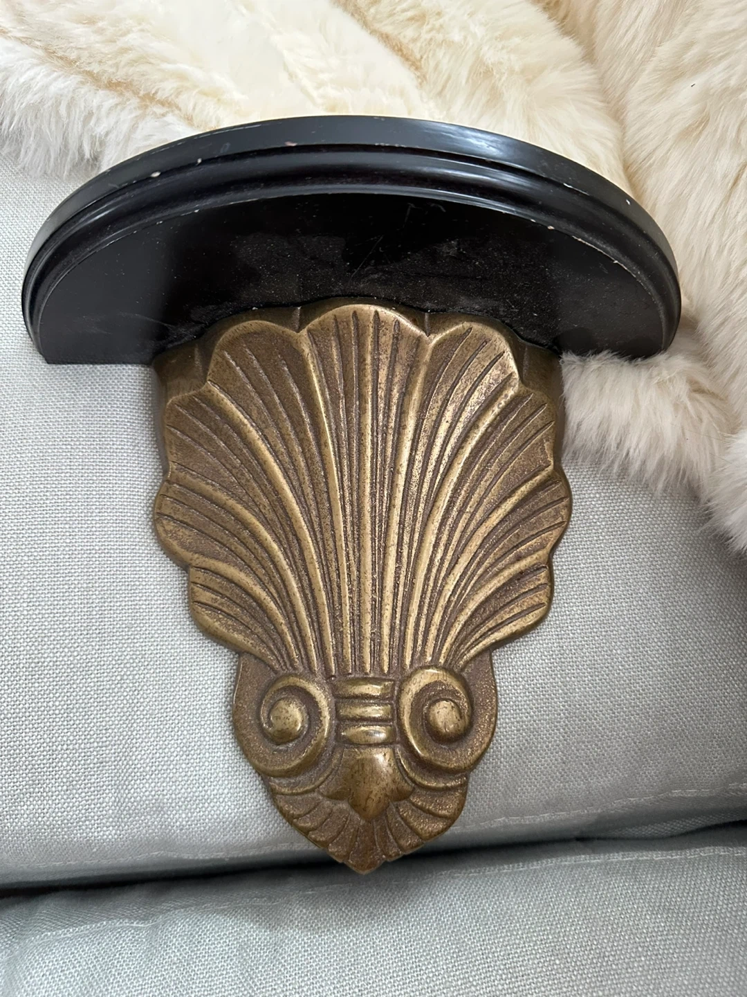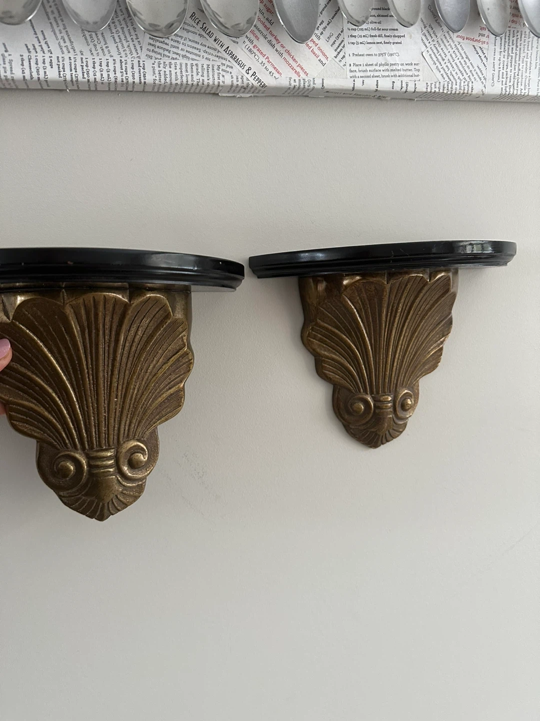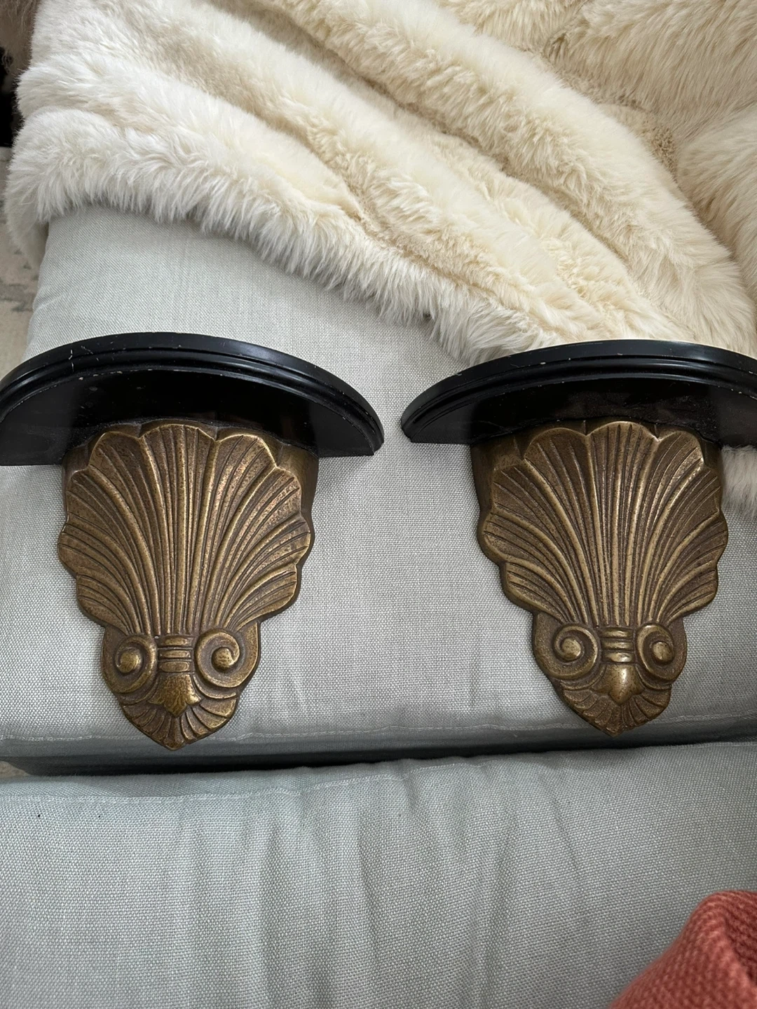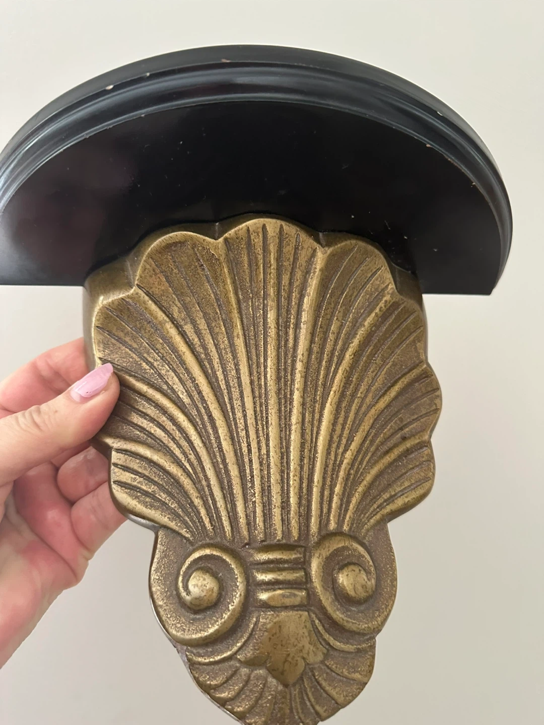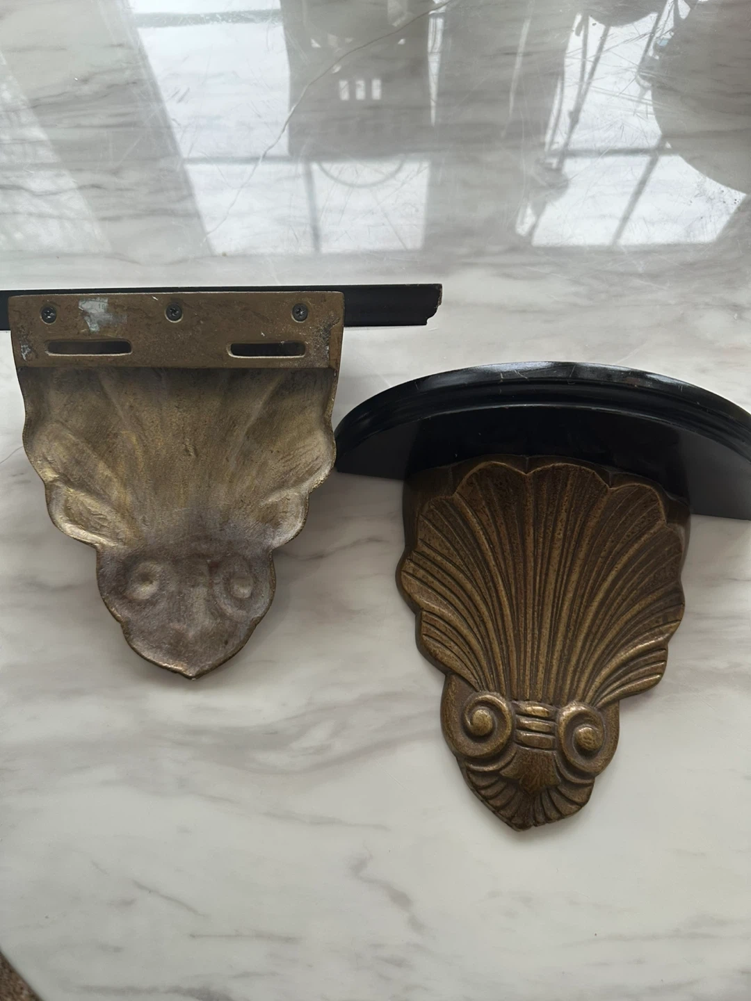 Set of two decorative wall shelves. Features a black wooden shelf with an ornate brass shell-shaped bracket. Each shelf measures approximately 7 inches tall. Perfect for displaying small decor items!