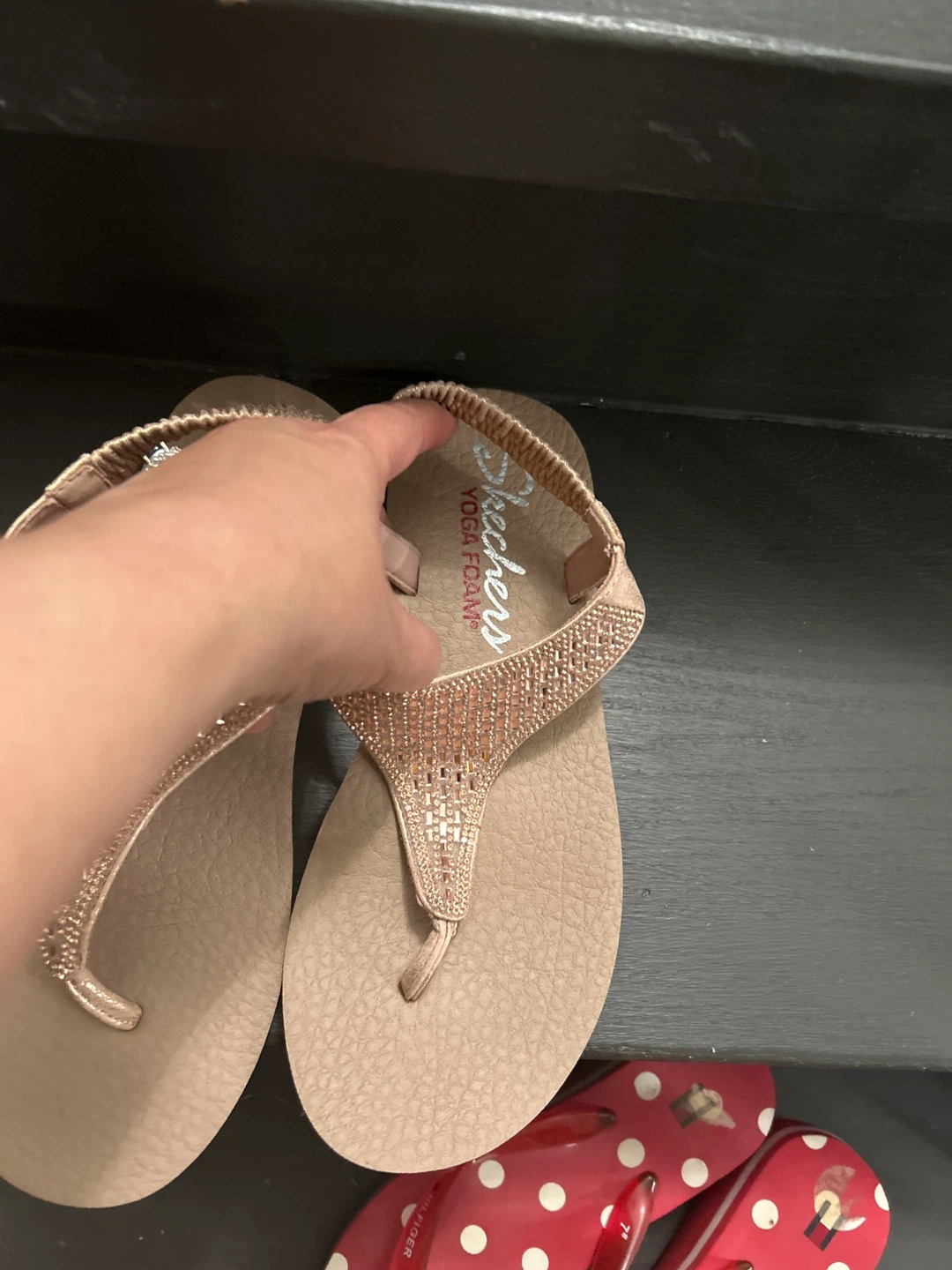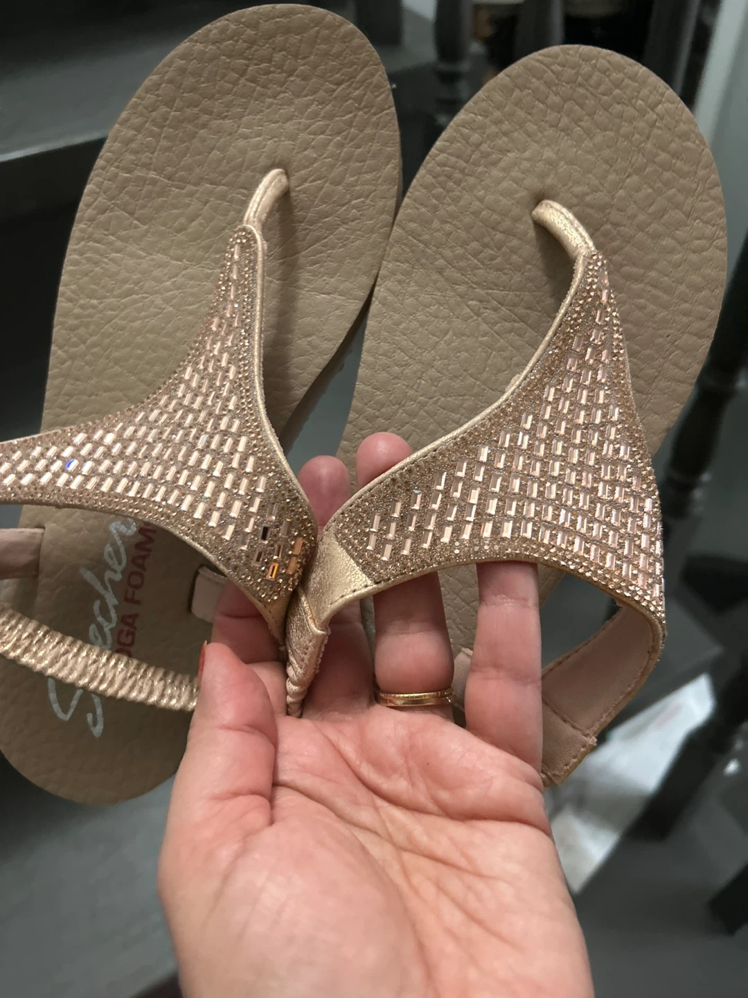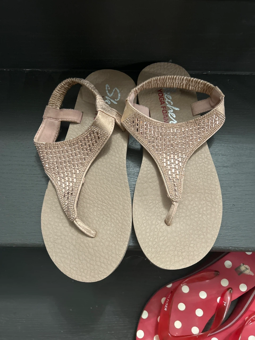 Comfortable Skechers thong sandals with embellished straps. Features yoga foam cushioning for all-day wear. Perfect for a casual day out or a trip to the beach!